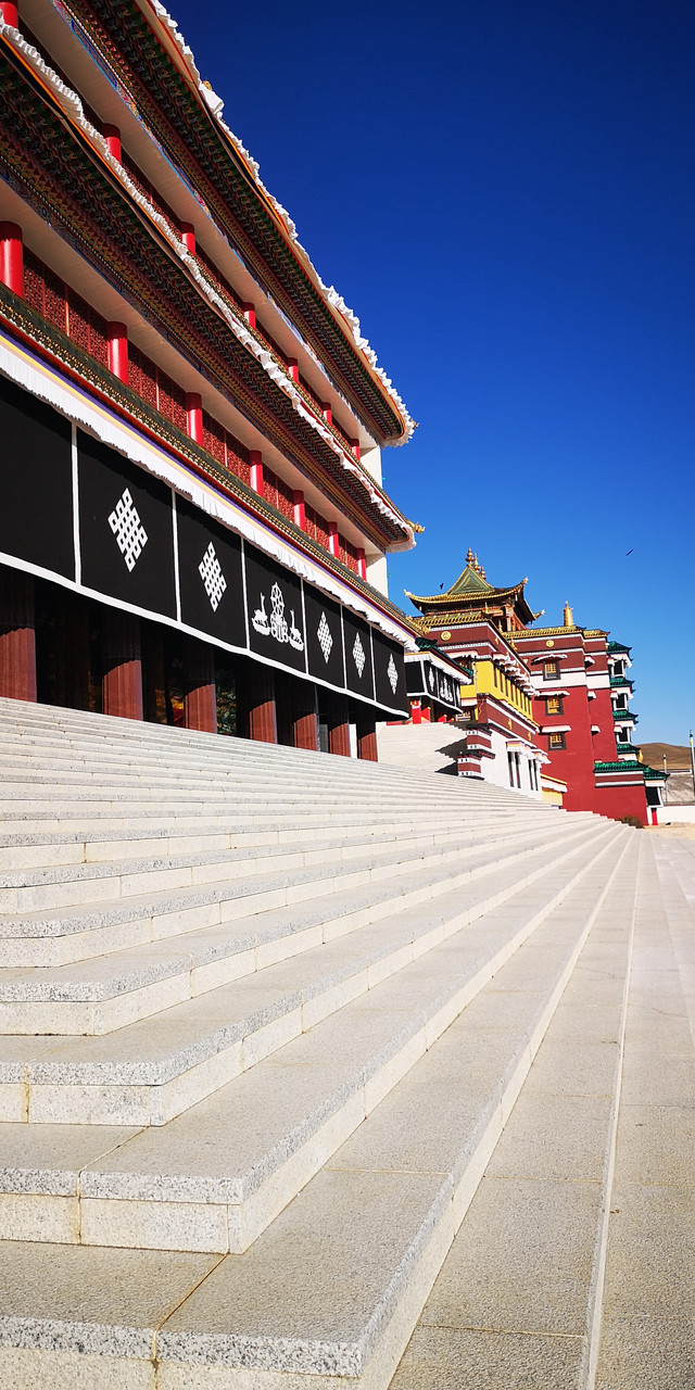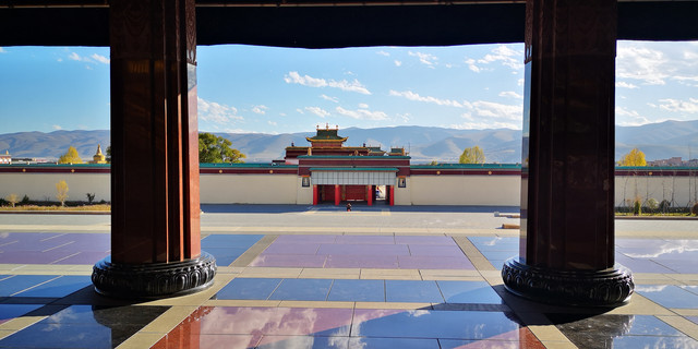 当我们推开寺庙的大门,被眼前的场景惊呆了。一个不起眼的寺庙小门内掩藏着一个如此大的广场,宽畅的花岗石地面,十分现代前卫的设计,令人震撼。还有一个宏大精美的建筑法喜院,是联波活佛出资修建的,历时五年,于2018年建成。大气庄重,蕴含藏民族特色。苑内装饰精美,雕梁画栋无不体现着艺术的瑰丽,奇珍异宝无不展现着寺院之博物。就主殿门外的8根立柱竟然都是金丝楠木,那个粗啊,一个人都抱不过来。这是我见过的最粗的金丝楠木,也是最不受待见的金丝楠木,竟然就被当成柱子来用。这里的每一块木料、每一块砖石都是稀有之物。再看看大殿墙壁上的各种壁画和唐卡,各种叫不出来的装饰,以及每座佛像的高度、精美程度,让人叹为观止。