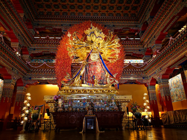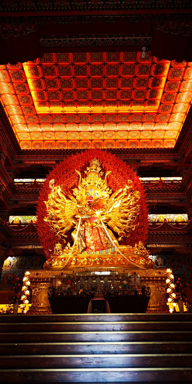 满眼都是金光闪闪的佛像,看得我眼花缭乱,神志恍惚。走出大殿,最东侧是大威德金刚殿,供奉着大威德金刚佛像。大威德金刚是密宗五大明王之一,九头、三十四臂、双身像、十六足,据说是文殊菩萨为降伏死魔而化现的。最西侧是时轮金刚殿,供奉着时轮金刚像。