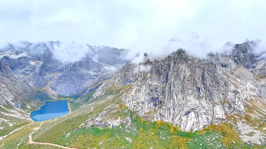 莲宝叶则·石头山景区有一条笔直宽广的公路,可直接开车进入景区,这简直是自驾出来旅行朋友们的福利,随着一声“到了”,迫不及待的想下车,下车的一瞬间我被这里美景震撼到了,此时此刻只想拿起我手上的相机就是咔嚓咔嚓的拍个不停,突然天空开始下起了雪,让此时的景区蒙上了一层神秘面纱等着我去揭开她,在宁静的湖面波光粼粼,水如明镜一般透亮,冰凉而又清澈,而在海子的对面还有一咖啡馆目前正在修建中,相信国庆去游玩的朋友应该就可以使用了吧,想象着一边喝咖啡,一边看着美景,真想说一句“巴适得板”喔。