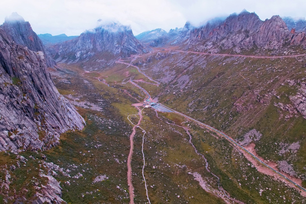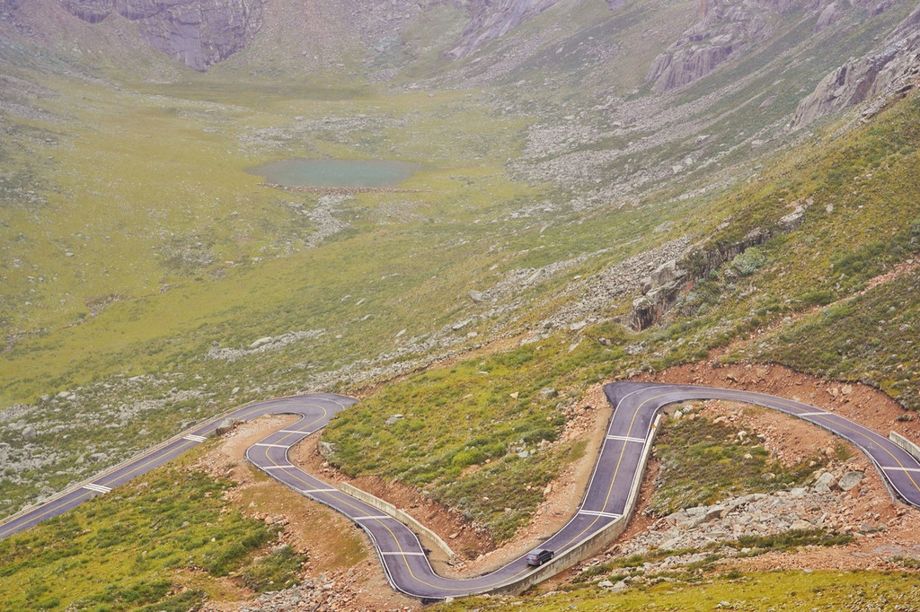 惜别柏香湖,继续前进游览,经过迂回盘旋的公路,抵达了海拔4424米的观景台。面向着对面气势滂沱的石峰山岭,这里屹立着一排错落有致的玛尼堆。在藏区玛尼堆是寄托灵魂的地方,因而神圣不可亵渎。在玛尼石堆之后就是山路崎岖的盘山公路,两侧各有一个小水坑,呈现出了天然的太极图之美。
