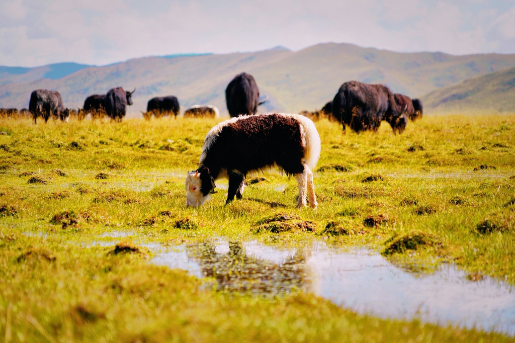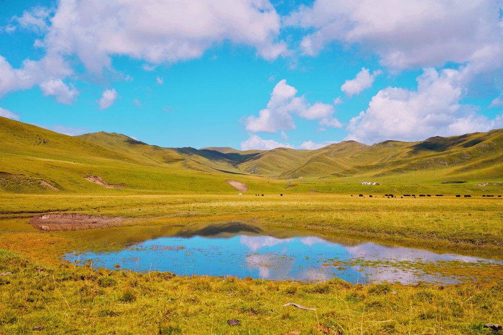 站在漫泽塘的高地之上举目远眺,纵横交错的河谷湿地,凸显了艺术世界的凌乱之美。晴空万里,湿地的小水坑里倒映着卷卷白云,一列气势轩昂的马群踏水而过,打破了水坑的宁静,这幅静美的草原画卷,突显生机。倘若时间宽裕,不妨在此吃个野餐,看着云卷云舒,守候绝美日落。