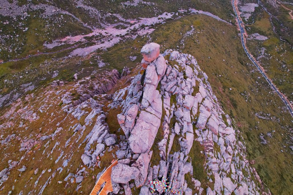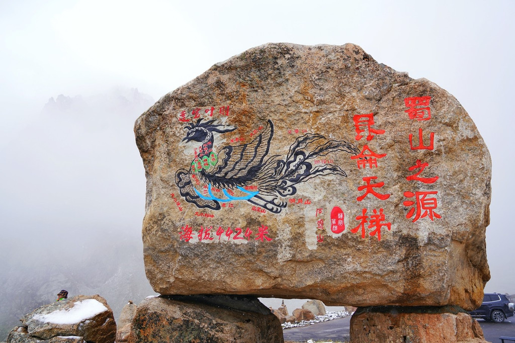 在海拔4424米的观景台上,还有一家即将对外开放全景玻璃的缘源圆咖啡吧。坐在咖啡厅里,喝着热饮,看着玻璃外那石雕艺术般的石头山,仔细的打望擎 天柱 、雄鹰展翅、两军博弈、千纫壁、鹰击长空等惟妙惟肖的石峰艺术奇观。而咖啡厅的户外栅栏旁边,屹立着一尊巨大的 磐石 ,上面刻画着莲宝叶则凤凰飞天的彩绘,更题着“蜀山之源,昆仑天梯”的赞誉。可谓是来莲宝叶则石头山景区必打卡的地方。