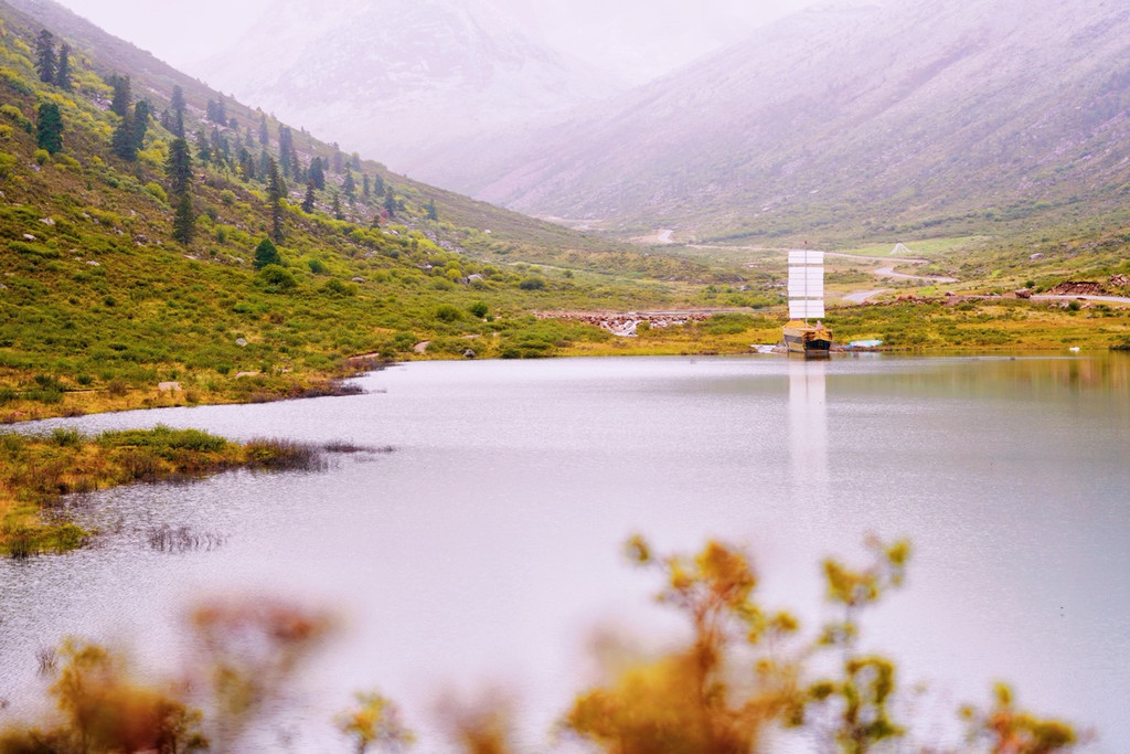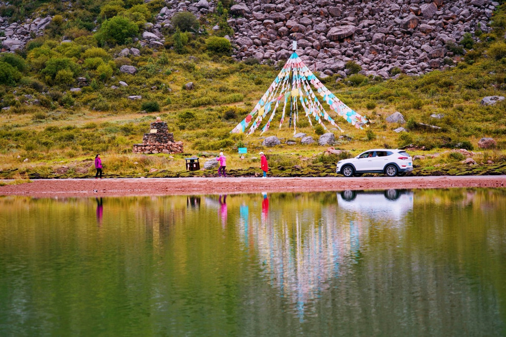 秋雪下的柏香湖,尤为静谧,四周的草甸渐黄,湖水微波粼粼,倒映着石头山的仙姿,呈现对称之美。湖中飘荡着一艘木船,乍眼望去,恍惚之间,似若走进了藏地格萨尔王城疆域。湖岸一侧是屹立着褐色石头塔,这是藏民与神灵沟通桥梁,其后随风飞扬的经幡,注入了藏民们内心的祈愿。而另一侧就是即将营业的帐篷咖啡厅,畅想一下看着鬼斧神工的石峰,望着蓝宝石般的柏香湖,品着香浓的咖啡,享受高原的惬意时光,岂不美哉?