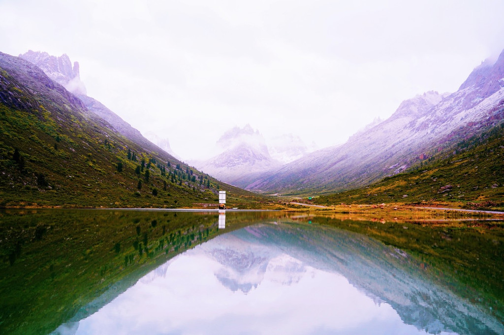 沿着珠姆措一侧的景区经典游览路线前行,一路奇遇柏香海、落霞湖、扎尕尔措三个绝美的湖泊。当车子驶入柏香海旁笔直的沿湖公路之时,天空中突然骤降秋雪。洁白的雪花似鹅毛飘洒落地,此时柏香湖被雪雾浓罩着,湖畔四周的巍峨高山若影若现,就像是一幅暗藏玄机的水彩墨画,妙趣横生。