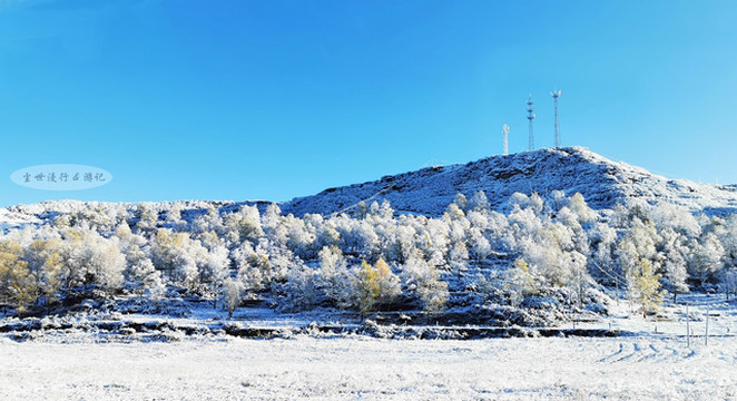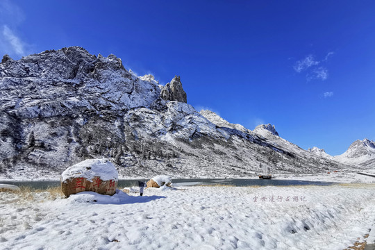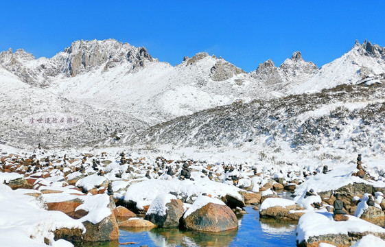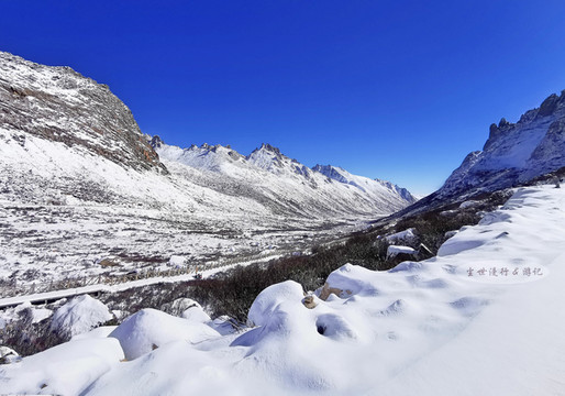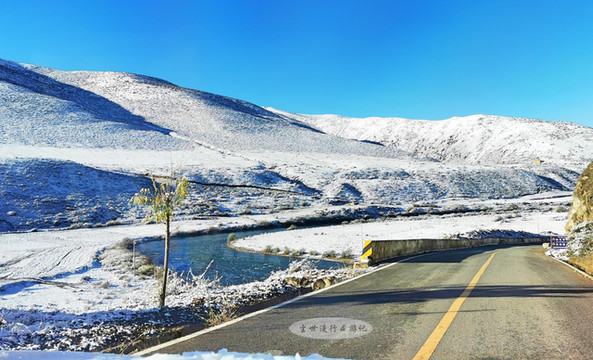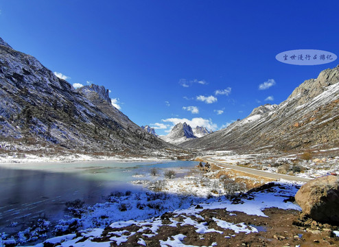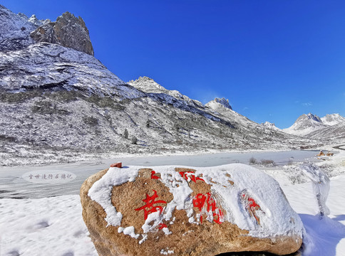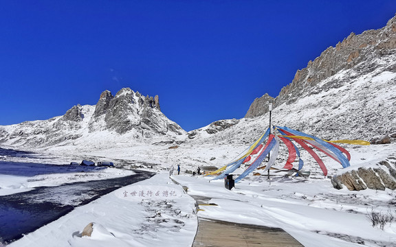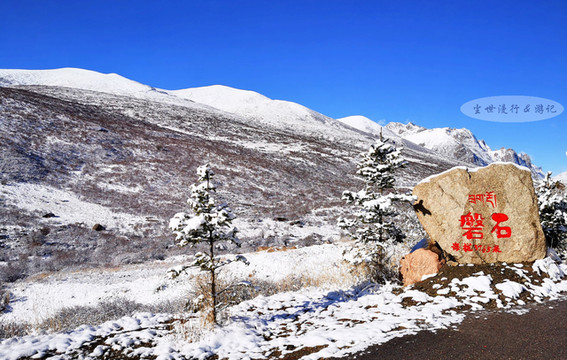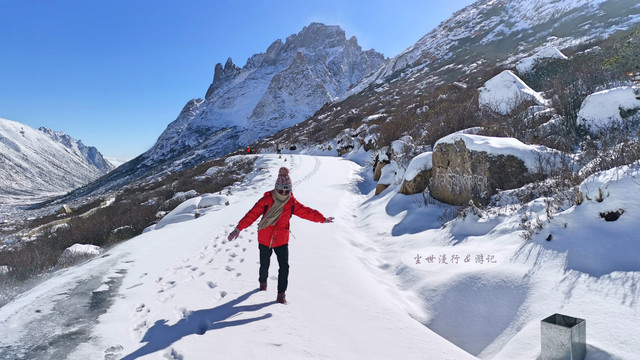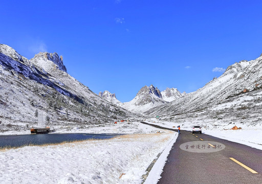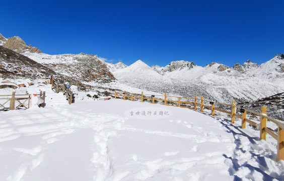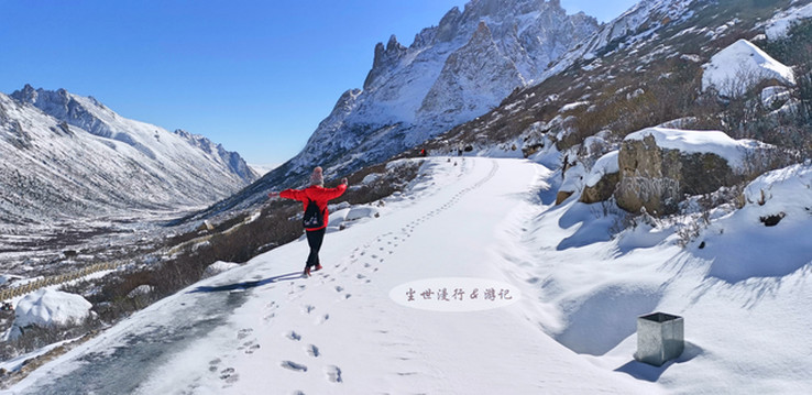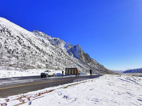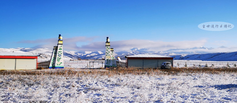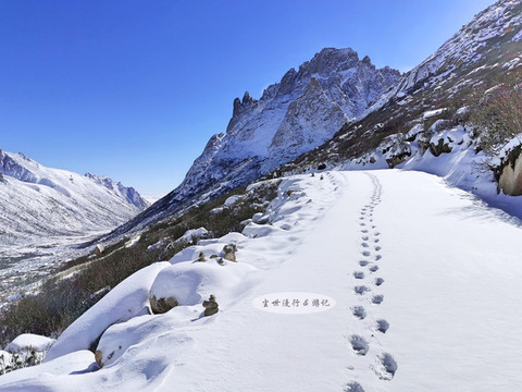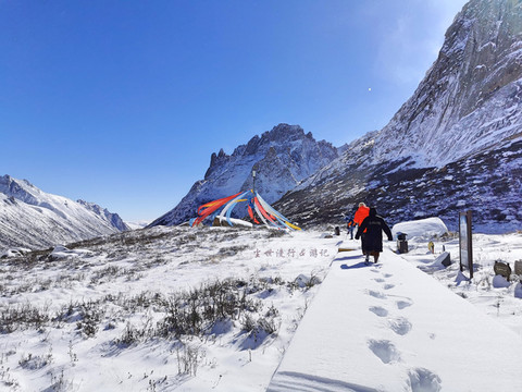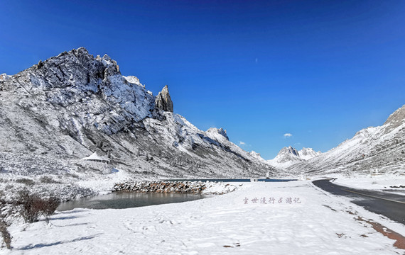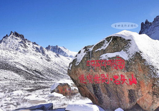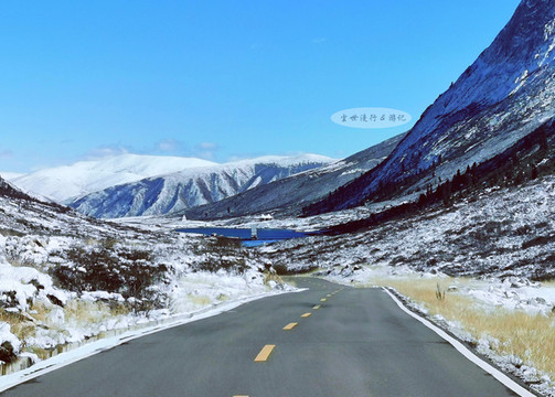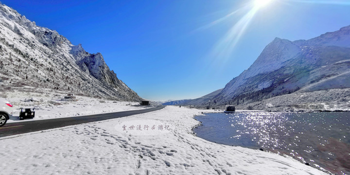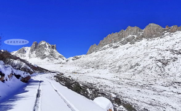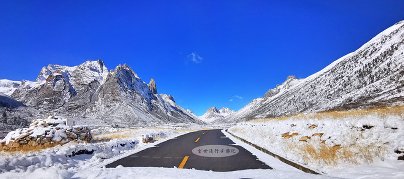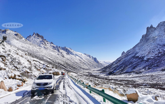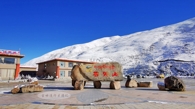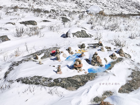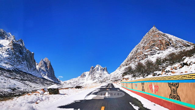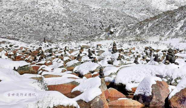渐渐地,黑色的柏油路被厚厚的积雪“淹没”了,柔软的白雪上留下一长串脚印,路边几堆小玛尼石堆正在为游客祈祷祝福呢。