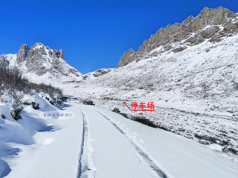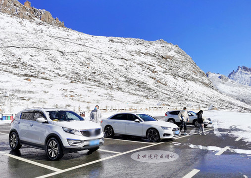 在景区中开车一个多小时才碰到两辆车。见俩车停在路上,先生便超越过去,前面有景区的“皮卡”正在装戴防滑链。先生下车咨询工作人员后被告知:沿着此条路往前开不远便是河源服务中心,把车停在停车场,再沿着对面雪山坡上的路走半小时即到达扎尕尔措。