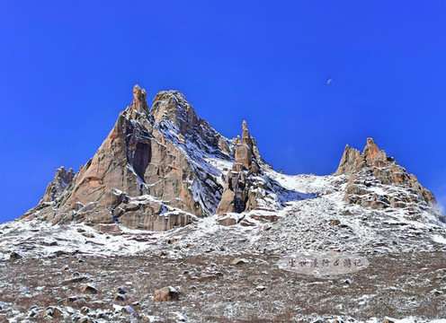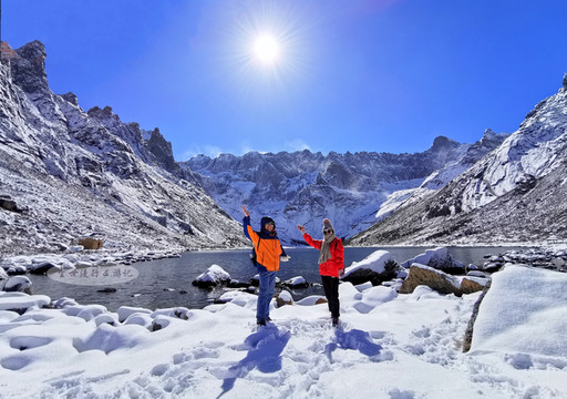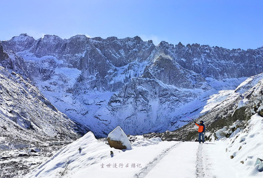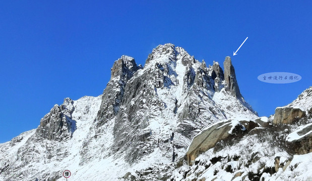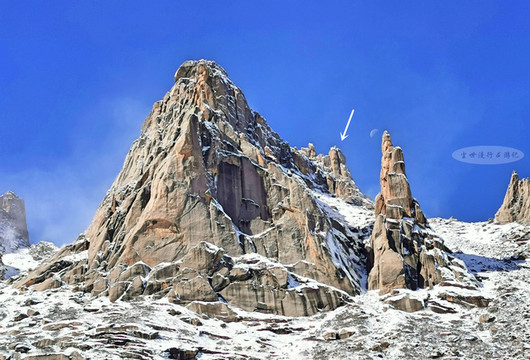 右侧雪山坡上的角峰引人注目。这组角峰被称为“左大佛,右观音”——一尊双手合十,神情肃穆地为芸芸众生诵经祈祷;一尊戴缨披袍,与杨柳观音几分神似,正在为世间过往慈航普渡。