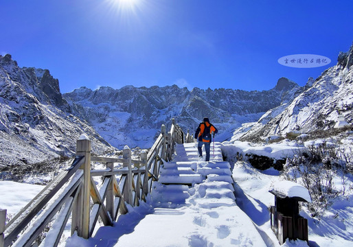 木栈道的积雪深至“脚脖子”处。深一脚浅一脚地踩着前面游客的脚印慢慢移动着脚步。