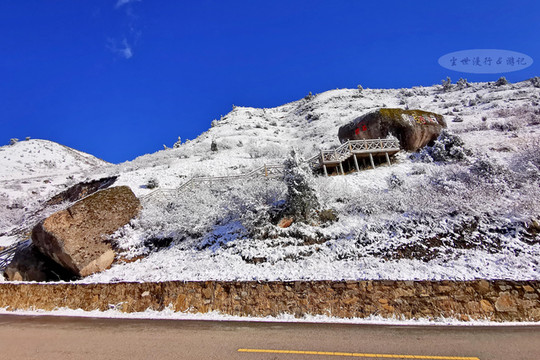 早上起床拉开窗帘,宾馆停车场的车顶上积着白雪。洗漱后赶紧吃早饭,早起的朋友已清理了车上部分积雪,稍作准备后驱车沿347国道前往莲宝叶则·石头山景区。