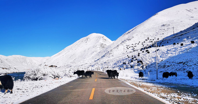 转过一座山头,黝黑的牦牛成了蓝白色彩里的主角。