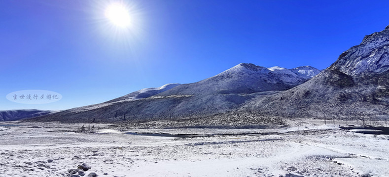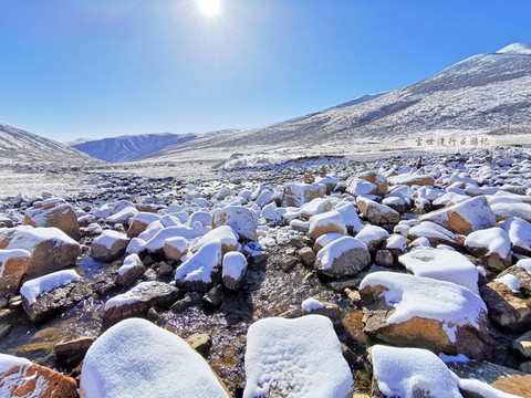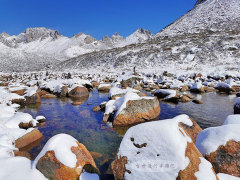 细看被白雪覆盖着的草甸上有一条条蜿蜒小沟,那是从莲宝叶则主峰潺潺而下,后在这座石头山脚下聚合成三条小河,分别汇入长江、黄河的源头,因此莲宝叶则顺势成为了“分水岭”,在这里把两条母亲河由聚拢变为了分开。