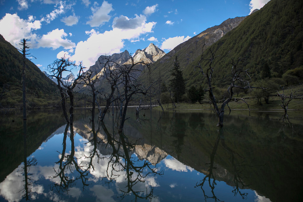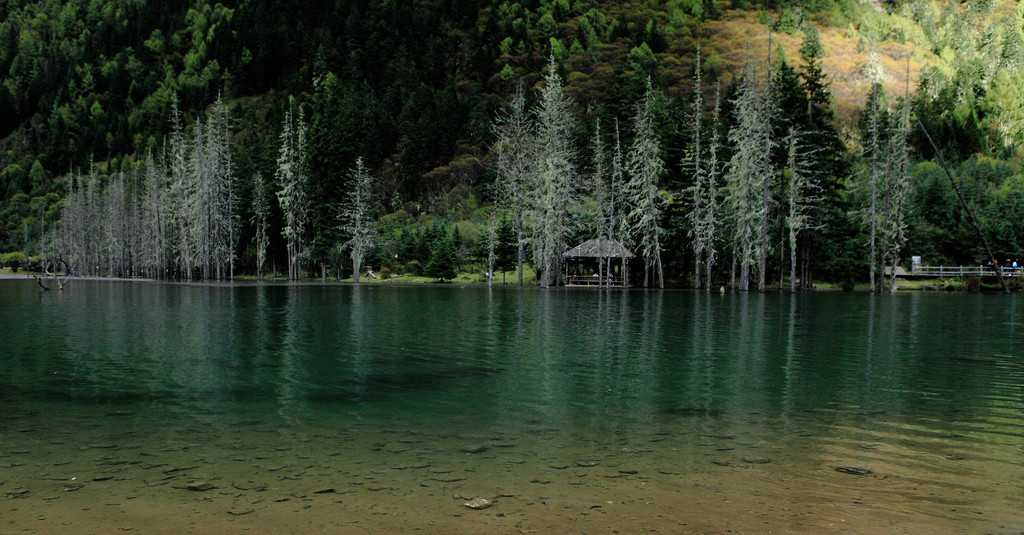 摄影人常说,光影是空间的魔术师,可以化腐朽为神奇。约下午四时,一束强烈的阳光从云层中透射下来,将湖中的几颗原本黢黑的沙棘照得雪亮,沙棘枝桠纤毫毕现,在墨绿色的湖水映衬下显得玉洁冰清、玲珑剔透,似雪挂雾凇,似白玉珊瑚。时光的悠远和岁月的沧桑以一种近乎圣洁的视相展现在眼前,此刻的四姑娜措美得让人窒息。