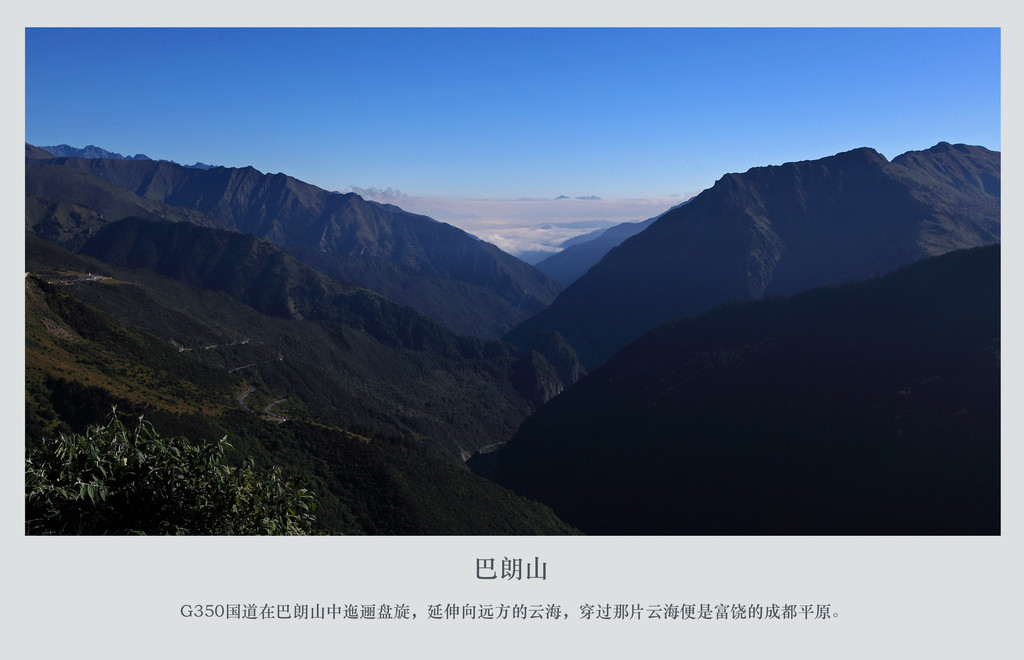 G350国道在巴朗山中迤逦盘旋,延伸向远方的云海,穿过那片云海便是富饶的成都平原。