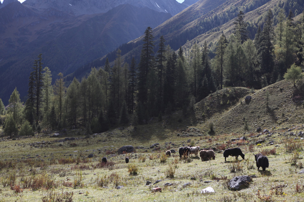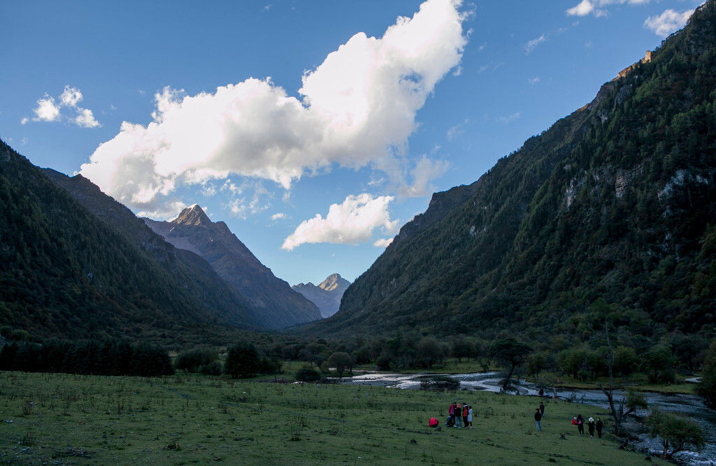 人参果坪距沟口约十公里,是交通车抵达沟口前的最后一站。车行至此,虽已近傍晚六时,获悉后面还有最后一班交通车可以乘坐后,我们便在此处稍事逗留。这里是一处约十五公顷的大草滩,绵延平缓舒展于峰峦之间。一条小河缓缓流过,河边密布着形态美丽的沙棘林。此地得名是因为在这片草甸下面生长着一种名贵的蔷薇科地茎植物,学名叫“鹅绒委陵菜”,嘉绒藏族人称之为人参果。传说是四姑娘山神为了救助这一方黎民祛病消灾,去佛祖那里求来仙果播种而得。人参果皮黑肉红,味道甘甜,既可食用,亦可入药,其药用价值与人参相同,颇具益气补血、滋阴壮阳的功效。