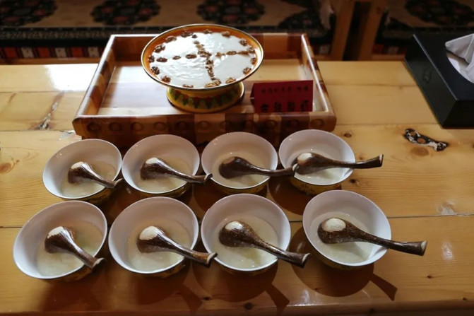 酥油茶是藏族的传统饮料,由酥油、核桃、纯牦牛奶等加工制成,有止渴御寒的功效。