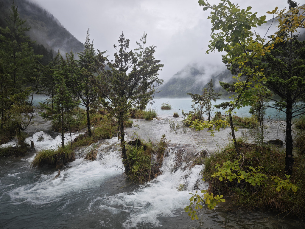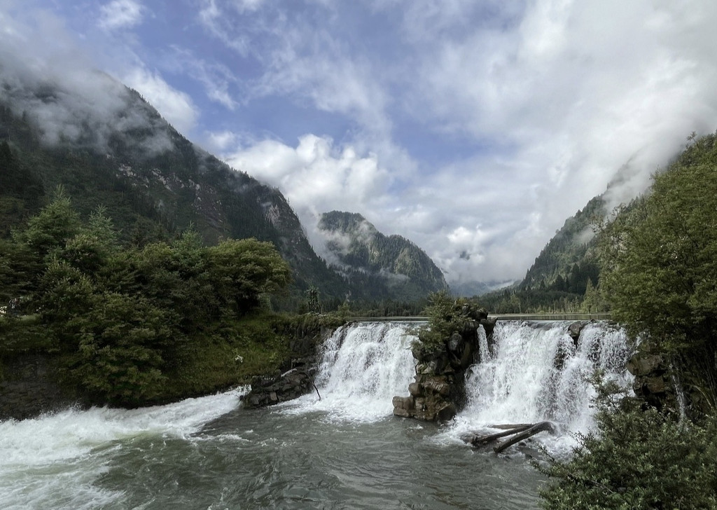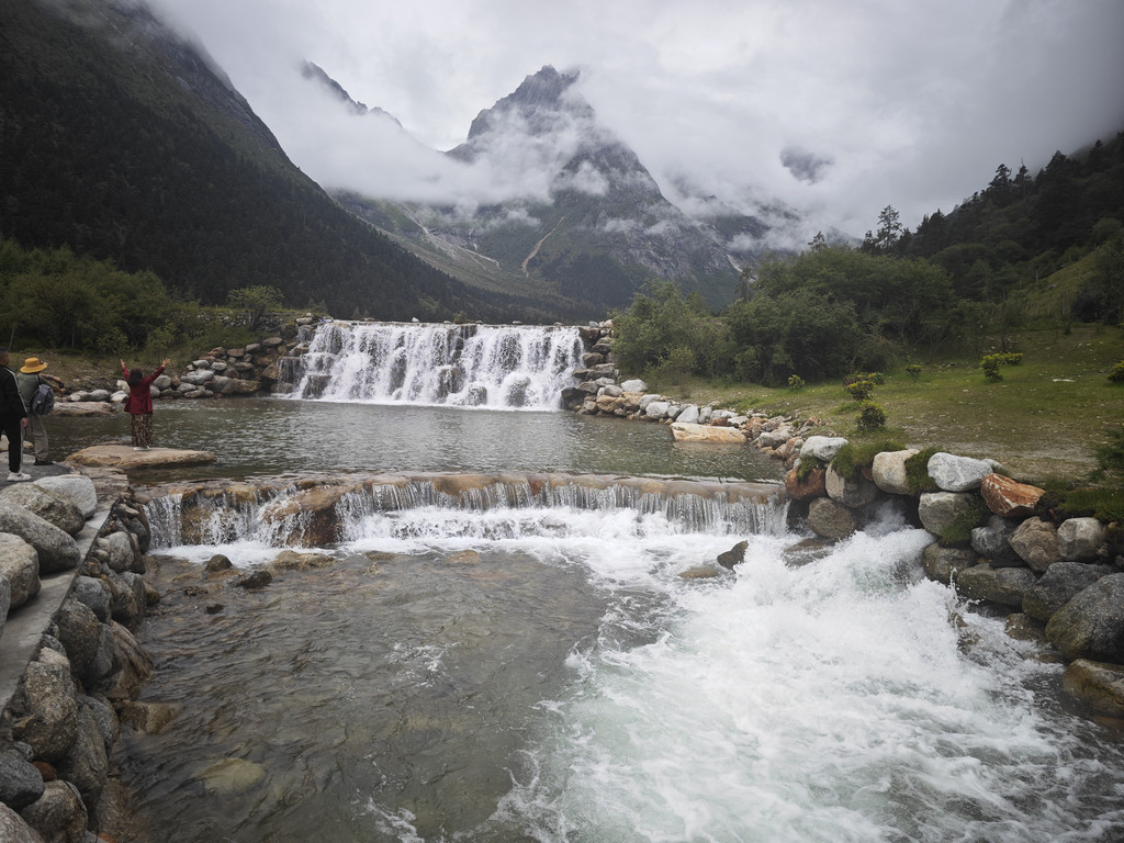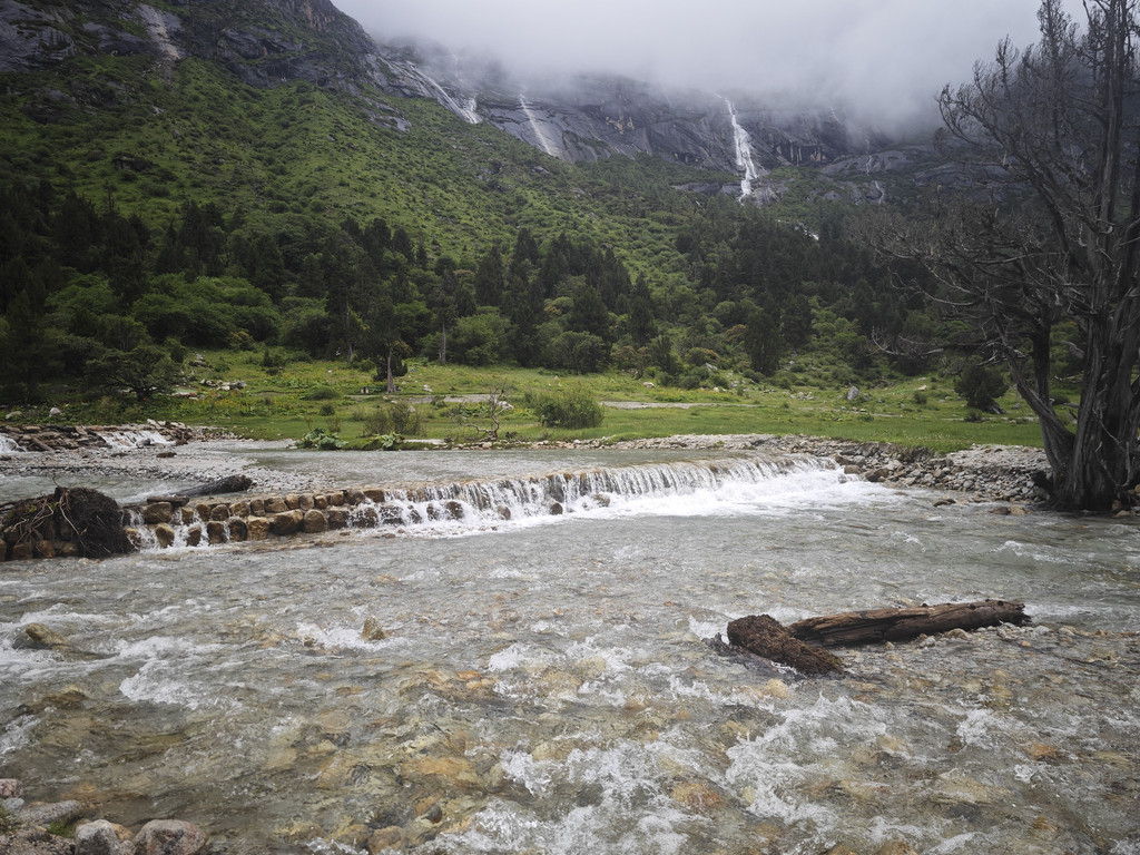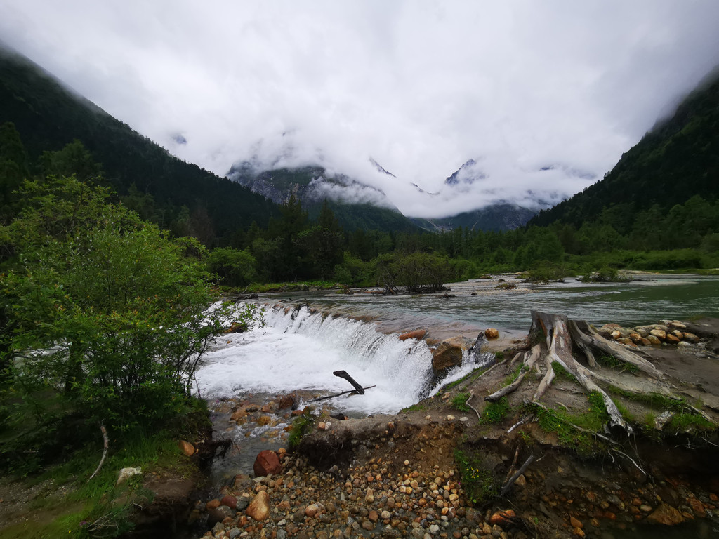 白龙瀑布对面的卓玛滩景色也特别美,远处的高山被云雾遮挡,若隐若现,清澈的河水冲刷着石头和枯树。逃离了喧闹的大都市,置身这里,感觉一切都那么赏心悦目。