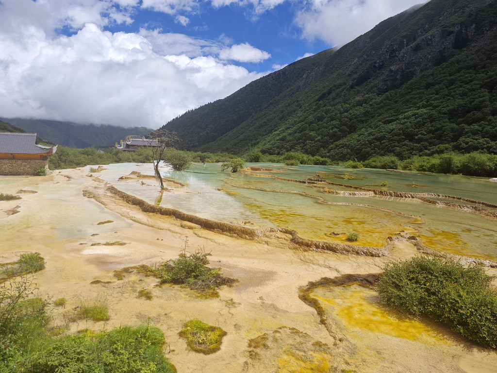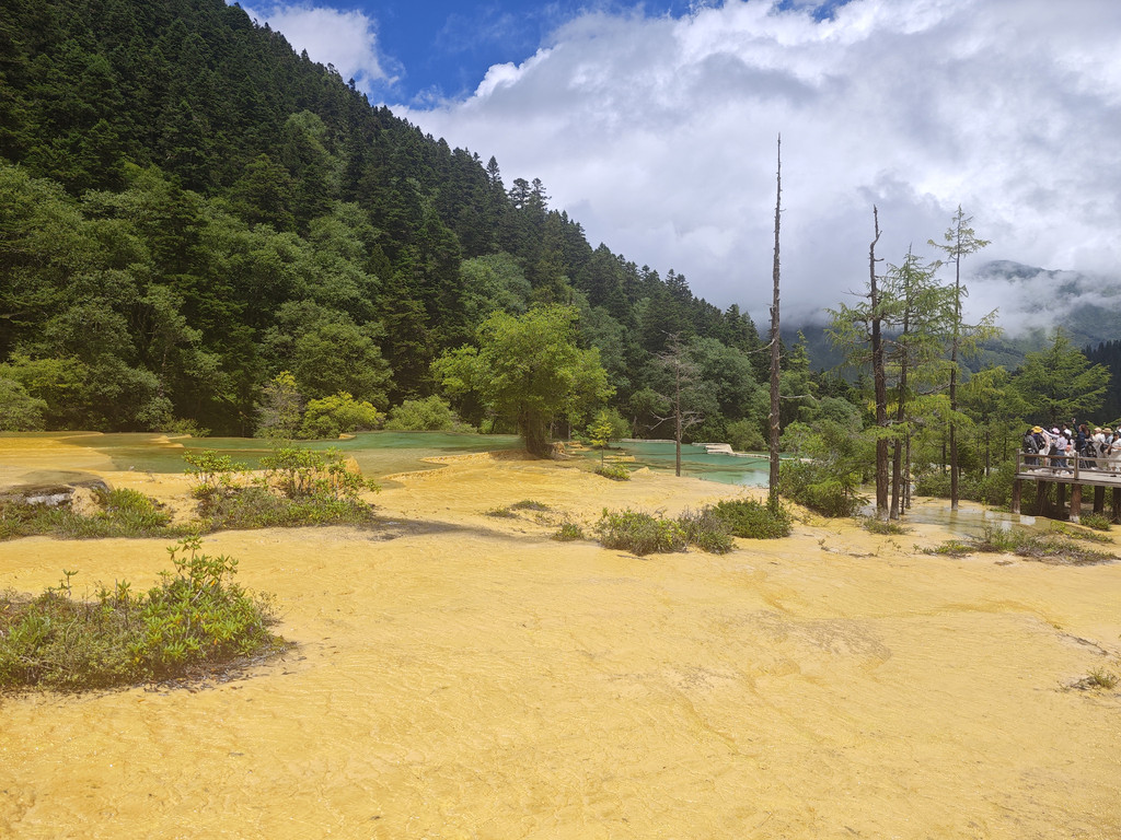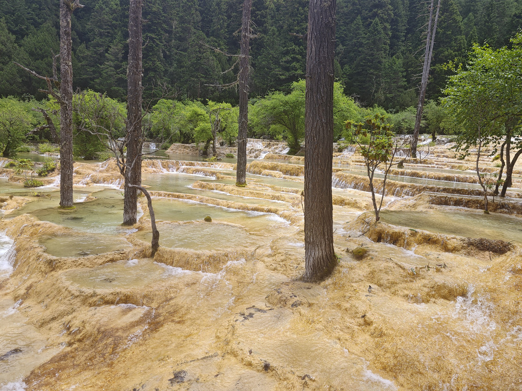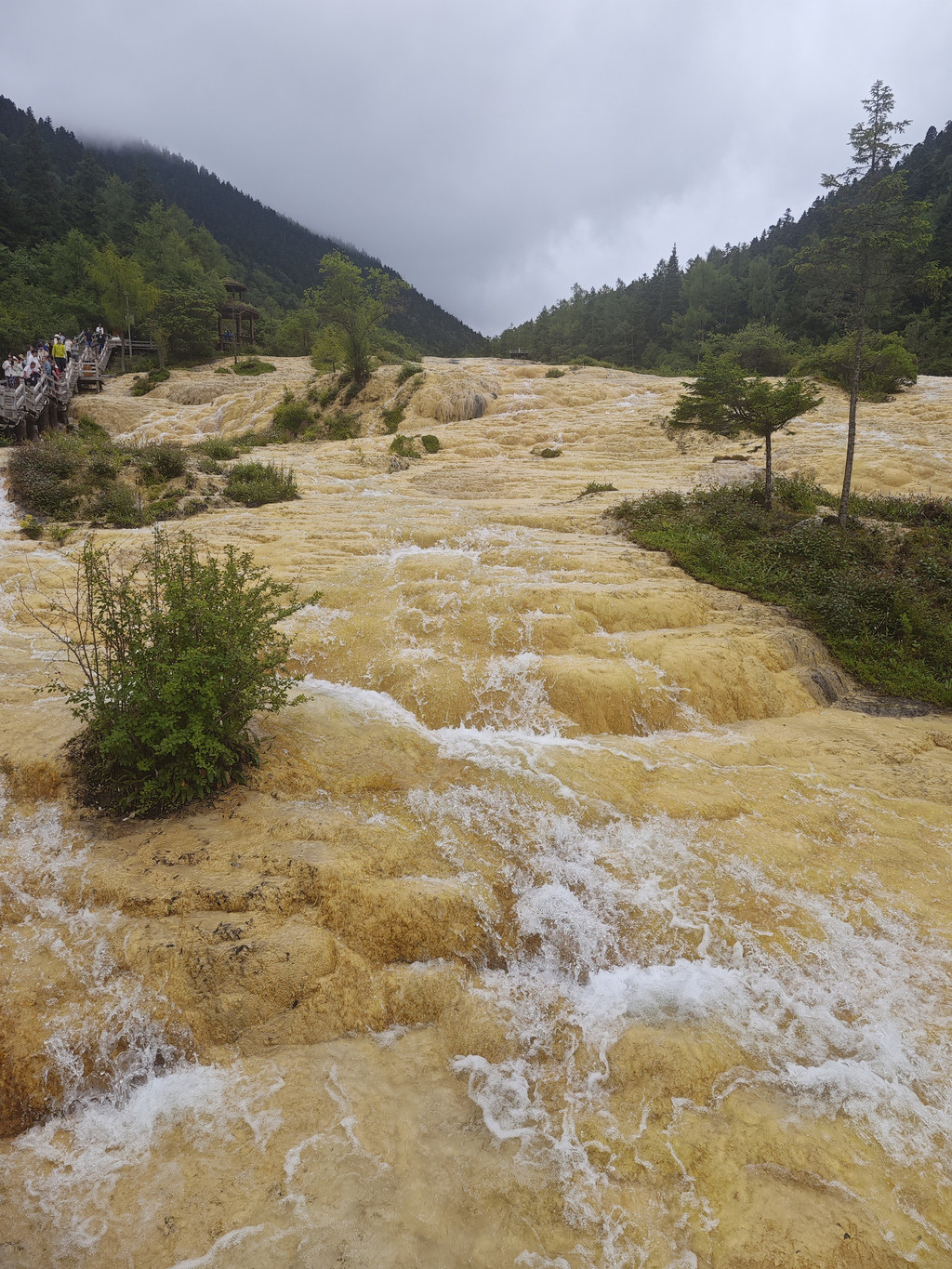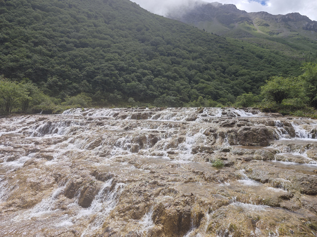 金沙铺地,以金黄色为主间或镶嵌着乳白色、灰色、暗绿色等色块的坡面上,流淌着薄薄的一层水波。水被常因坡面钙华的鳞状层叠而荡漾着银色涟漪,犹如金河泻珏,银水溢流。散生在钙华流上的簇簇水柳、山花,好似河中漂泊的彩船,人游此地,大有飘飘欲仙之感。
