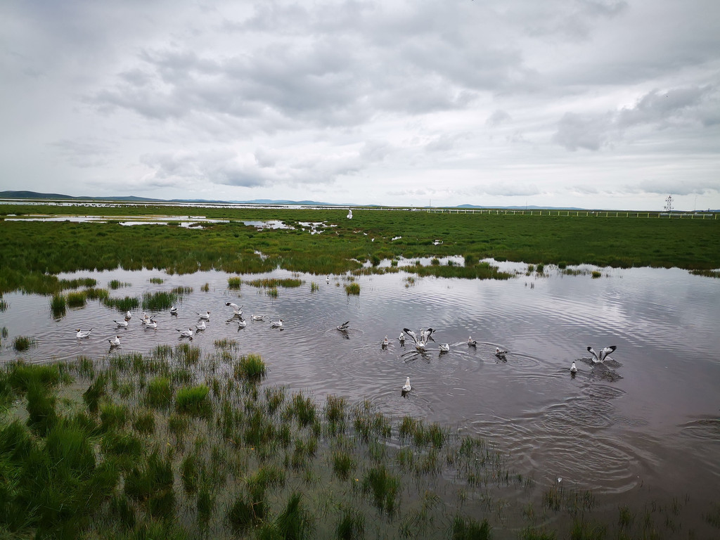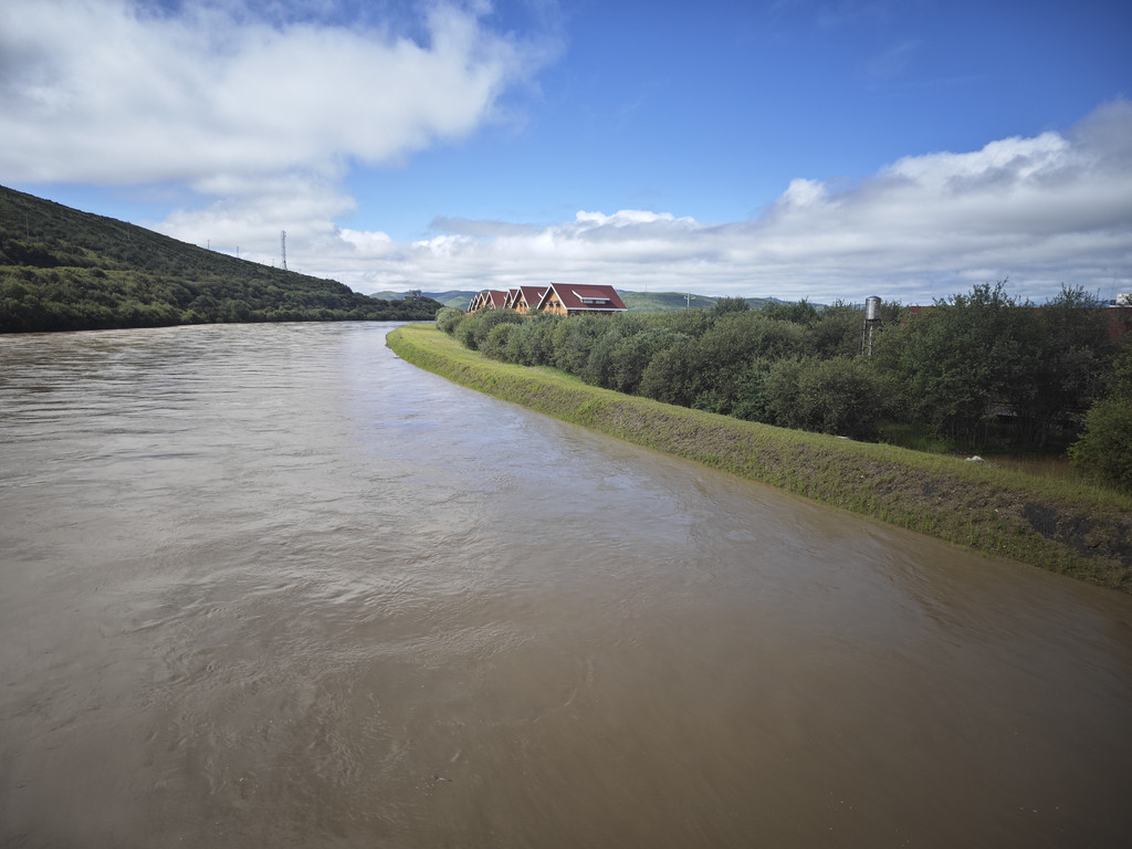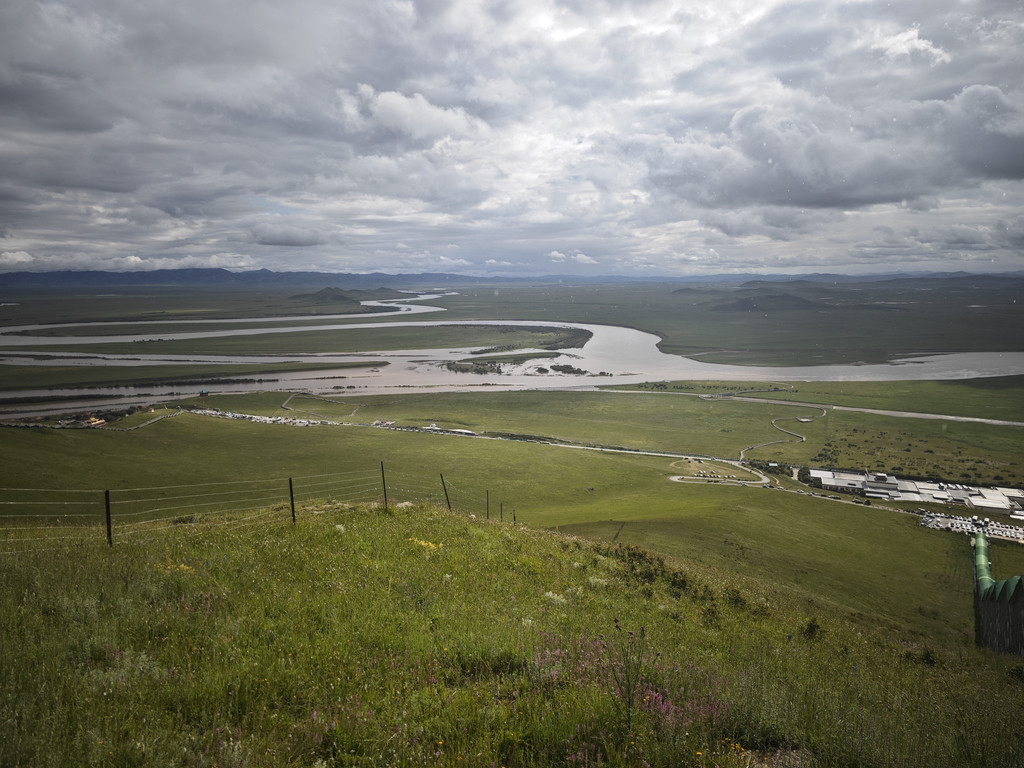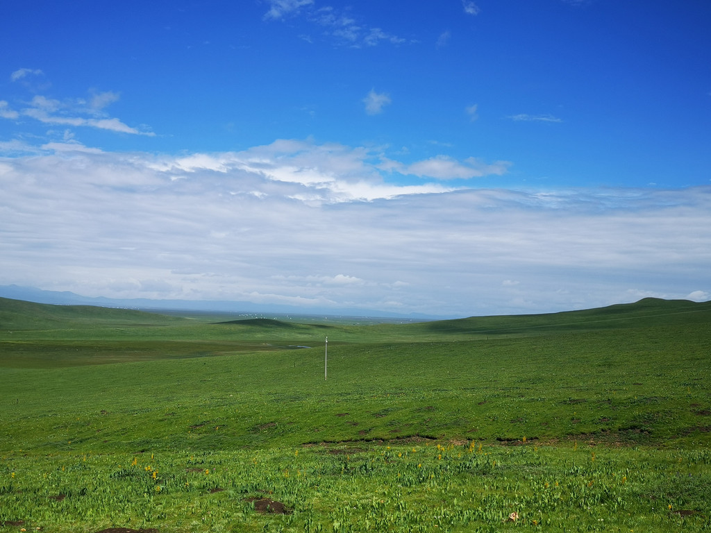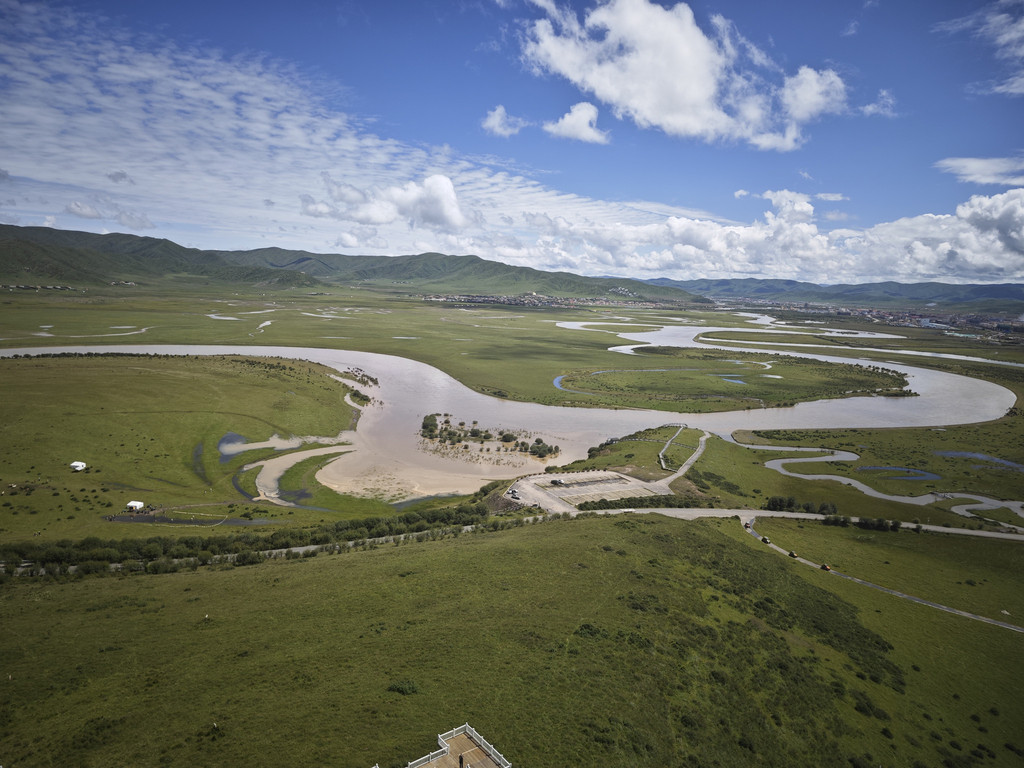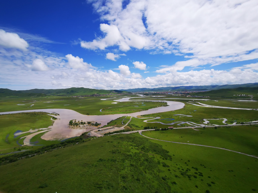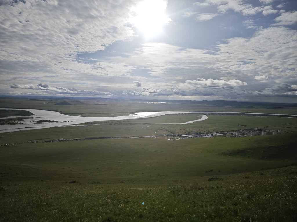 在观景台上可以看见白河蜿蜒的平躺在广阔的草原上,还有蓝天白云相映衬。特别是今天的白河水量大,河道又有些杂乱无章,夹杂着一种粗狂感。