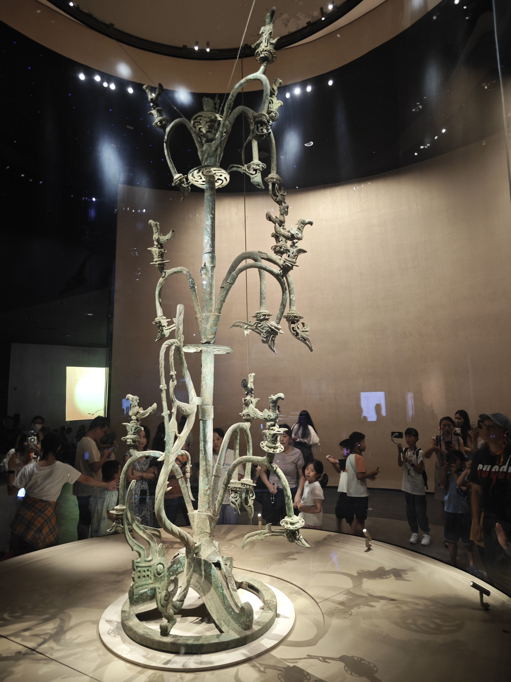 商青铜神树:Ⅰ号大型铜神树由底座、树和龙三部分组成,采用分段铸造法铸造,使用了套铸、铆铸、嵌铸等工艺,通高3.96米,树干顶部及龙身后段略有残缺。在我国迄今为止所见的全部青铜文物中,这株神树也称得上是形体最大的一件。 铜树底座呈穹窿形,其下为圆形座圈,底座由三面弧边三角状镂空虚块面构成,三面间以内擫势的三足相连属,构拟出三山相连的“神山”意象,座上铸饰象征太阳的“☉”纹与云气纹。树铸于“神山之巅”的正中,卓然挺拔,有直接天宇之势。树分三层,每层三枝,共九枝;每枝上有一仰一垂的两果枝,果枝上立神鸟,树侧有一条缘树逶迤而下的身似绳索相辫的铜龙,整条龙造型怪异诡谲,莫可名状。