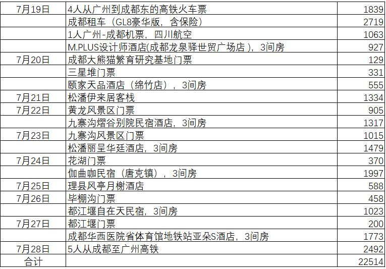 出发前预订的支出情况,酒店、门票、机票共支付22514元,其中不包括岳父从大同往返成都的机票,大约2000左右,实际应该支付25000元不到。