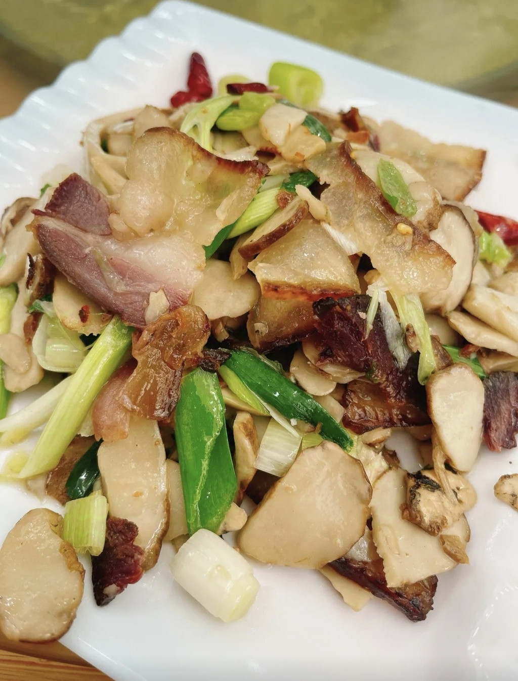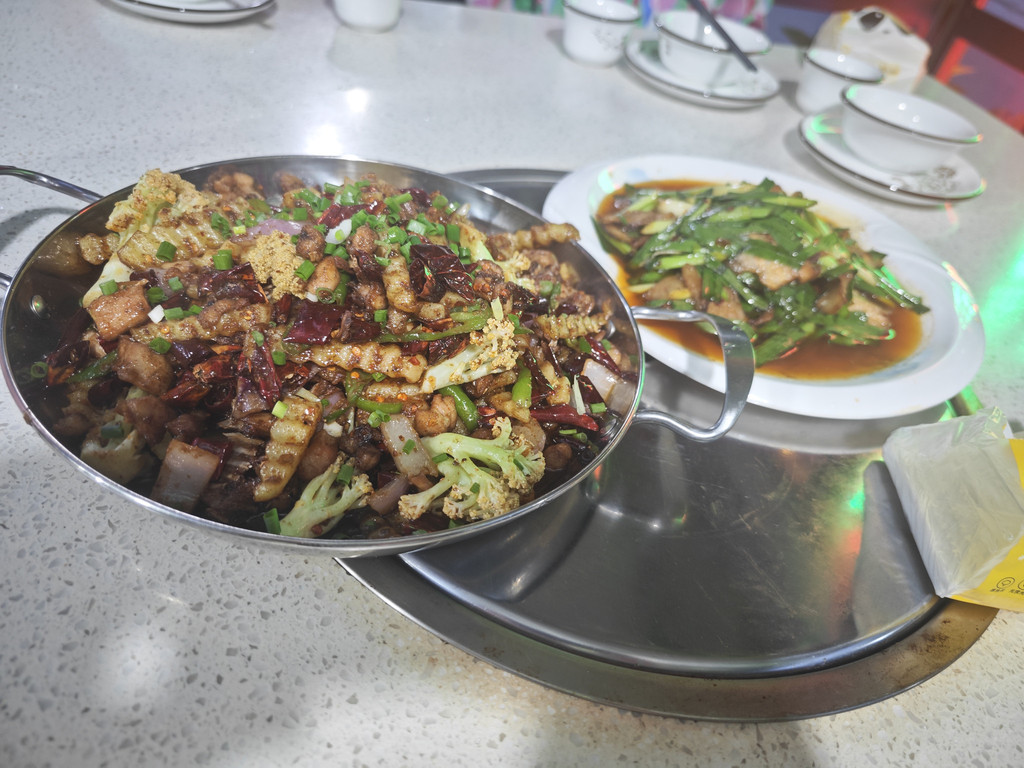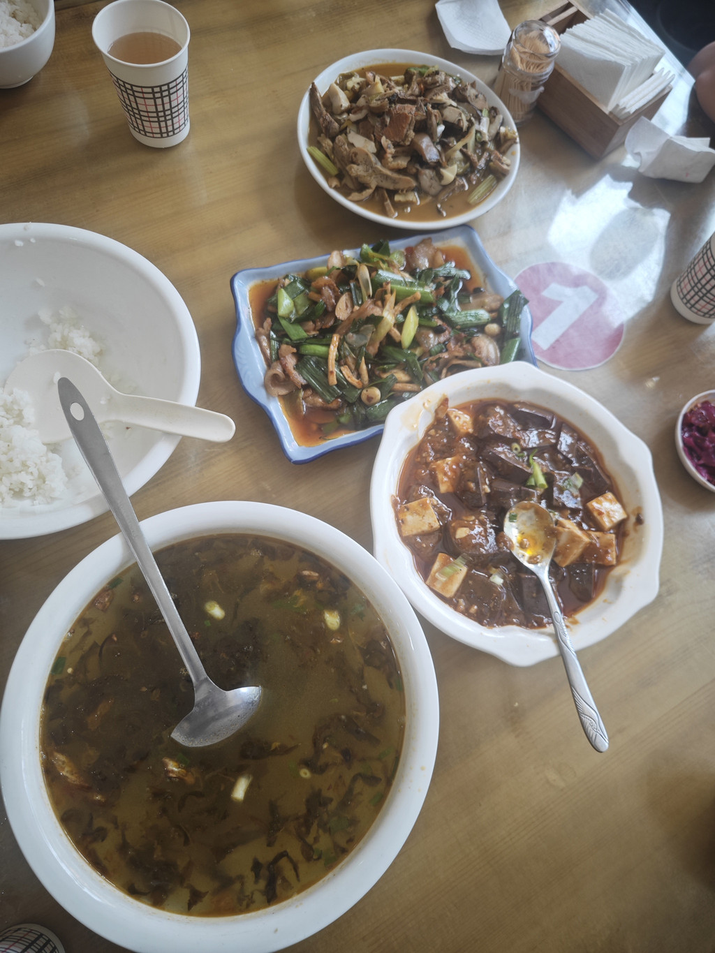 点了红白豆腐、蒜苗回锅肉、野生菌、青菜和酸菜粉丝汤。出乎意料的好吃,老板热情,边吃边和我们聊天,回锅肉居然用的是二刀肉,做菜很规矩,值得推荐。