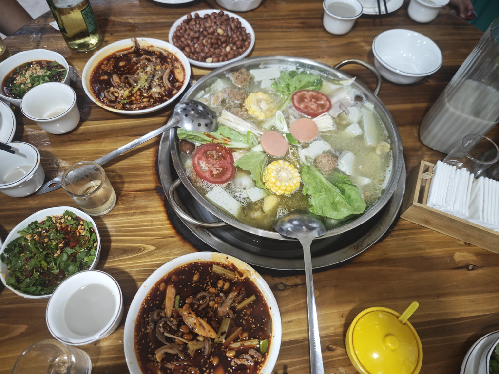 黑豆花很嫩,吃起来绵软混杂着豆香。面上的酥肉和圆子都是事先炸过的,一个锅里的荤菜素菜有很多,我们点了4人份的,6个人差点没吃完。从海拔高的地方下来,大家今天终于可以畅饮啤酒。
