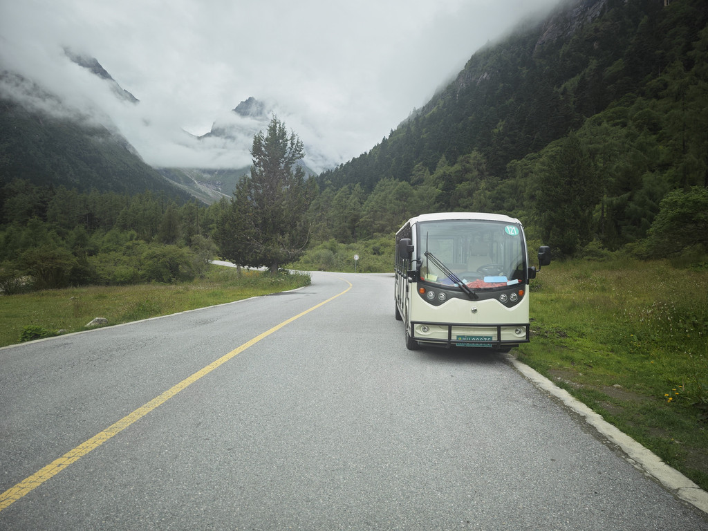 第一段电瓶车,上海子到磐羊湖,往返每人30元,现场扫码购票。这段电瓶车,中间在白马瀑布下车。