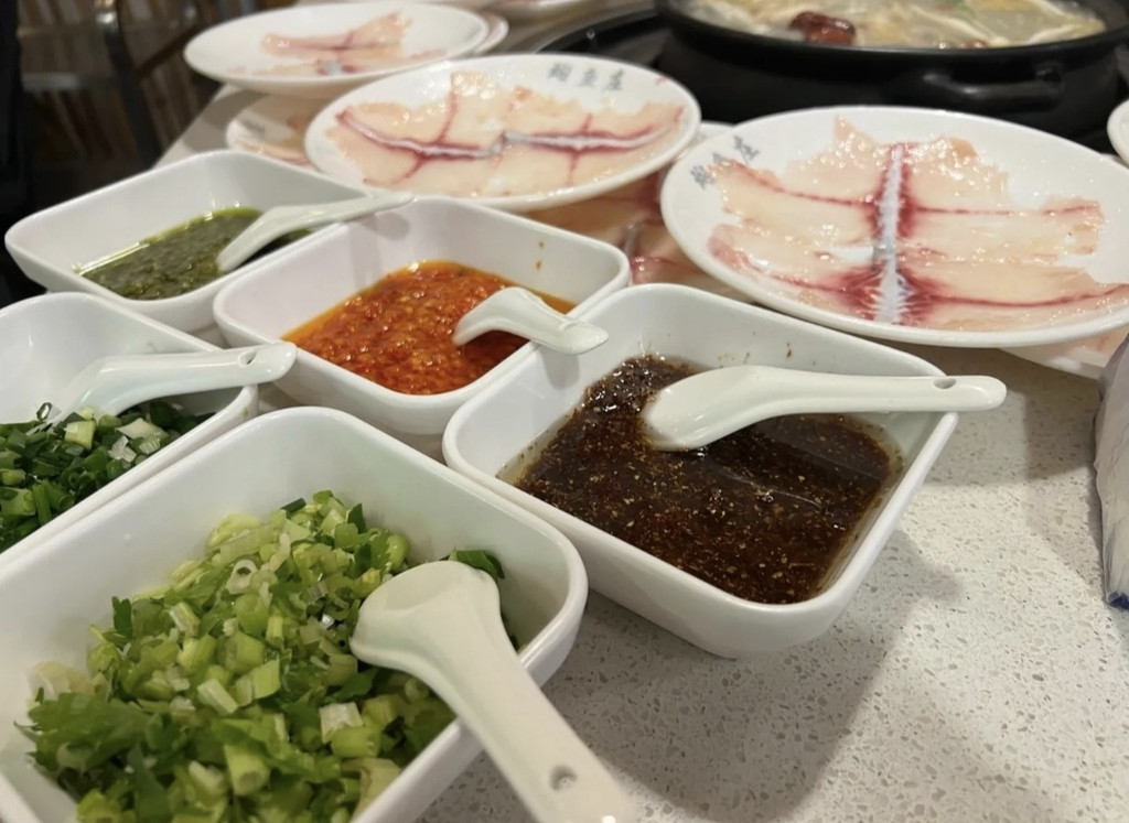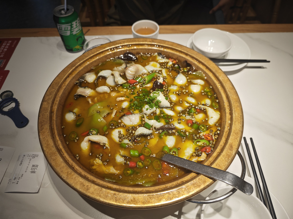 斑鱼实际上就是黑鱼,套餐是4斤斑鱼,感觉上了快20碟。蘸碟的辣椒和剁椒和好吃,鱼肉也很新鲜,套餐还有鱼丸和抄手,后来又加了一份手擀面,也很好吃。真的很努力也没吃完!
