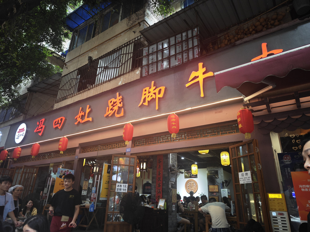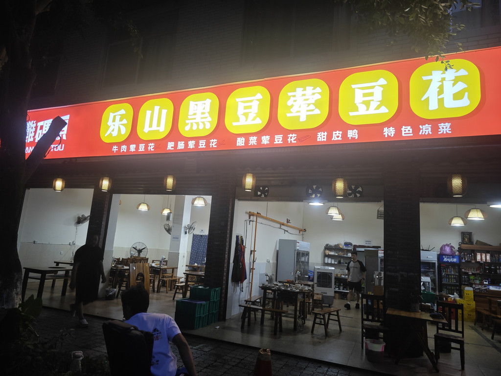 晚饭我们没有在旁边的美食街吃,走路1公里多,到居民区吃乐山黑豆荤豆花。感觉这边的店都是敞开式,也没有空调,吃的汗流浃背热火朝天。