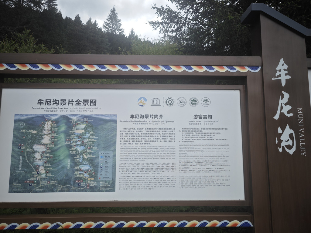 下午到牟尼沟景区。景区由扎嘎沟和二道海沟两个部分组成,景区景观融钙化瀑布、环形池瀑、高原溶蚀陷落湖、石钟乳、溶洞、钙化遗存、原始森林、高山草甸、硫磺温泉、珍惜动植物以及藏传佛教寺院、独特的藏寨风情于一体,并以“瀑布、湖泊、温泉、钟乳柱、民俗”五绝著称。