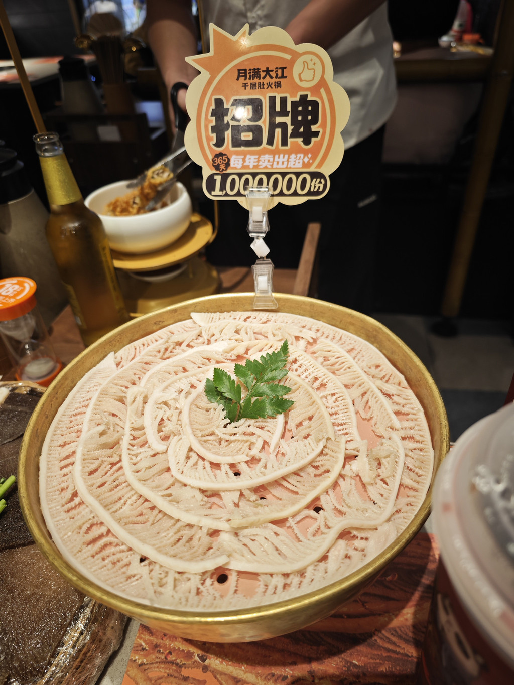 晚餐选在月满大江千层肚火锅(世贸广场店),在网上买了4人餐,选择的传统麻辣+资格番茄锅。麻辣锅比重庆要温柔很多,吃到最后还是有点麻。满月千层肚很大一盘,牛肚拼盘有4种肚,服务员也告知每种涮不同时间,还有强烈推荐的酸梅汤,料足好喝,解辣神器。