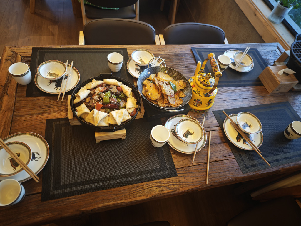 还有就是餐厅的出品绝了,牛肉盖被,干锅土豆,土豆包子,酥油香菇、莜麦菜和酥油茶。牛肉盖被的饼子蘸了牛肉香味,又很有韧性,后来我们又加了一份,土豆包子里面馅料是土豆泥,这种神奇的组合也很好吃,酥油茶是藏式的,咸咸的,也还可以接受。总之,这家民宿的晚餐出品精致、味道鲜美,价格也很适中,满满一桌,6个人都吃饱也才314元。