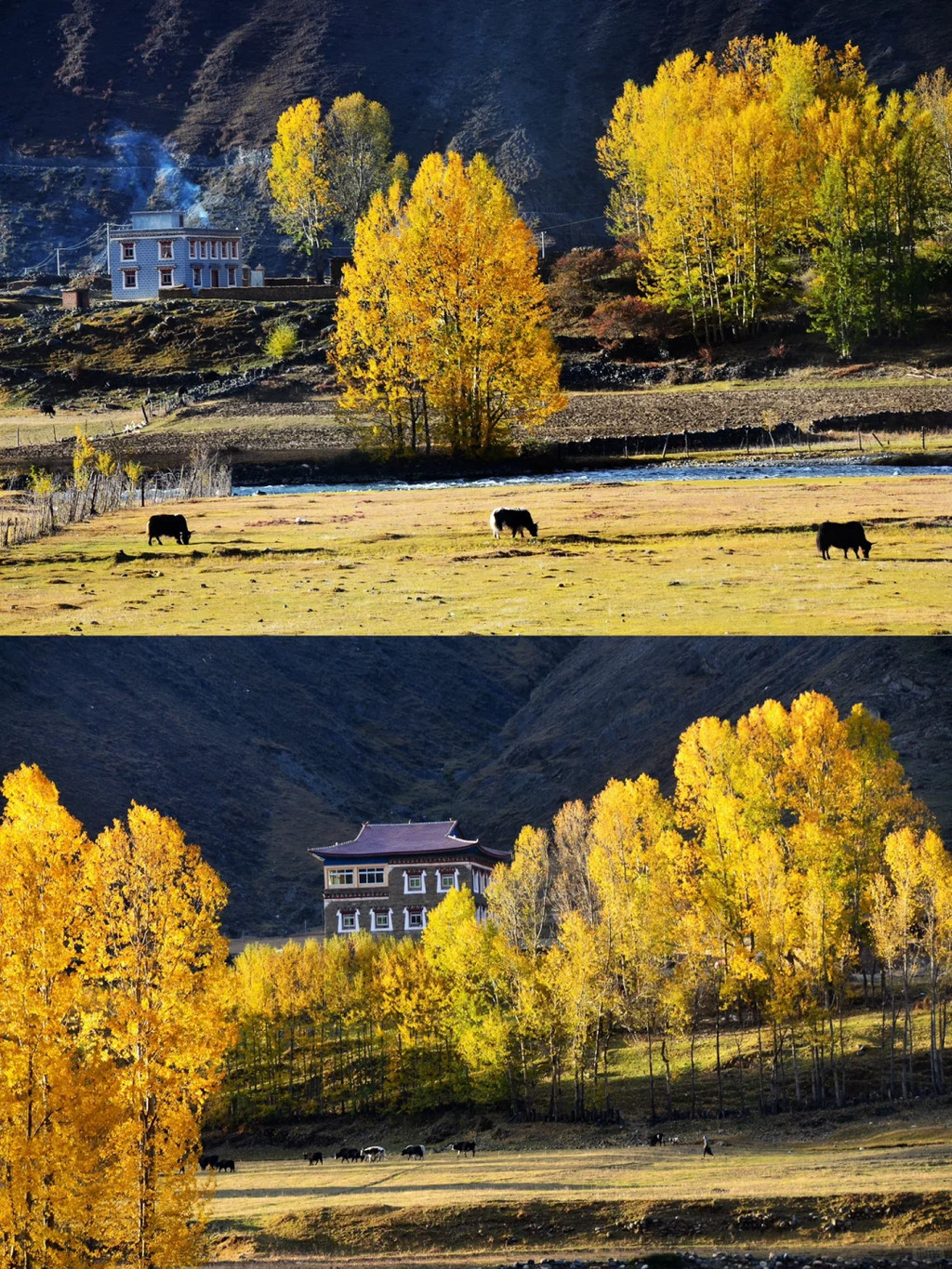 观赏时间:10月初-11月初枫叶、银杏、草甸、村落高山、湖泊、藏寨、草原和马牛羊