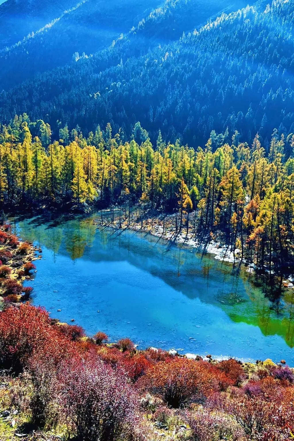 观赏时间:10月中旬-11月初雪山彩林、冰蓝海子、金秋红叶(桦林、红杉林、松树)、露天温泉Tips:海拔约3000m-4100m,不要门票,20元清洁费,摩托车去葫芦海单程200往返300;