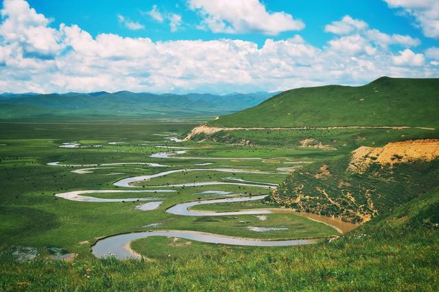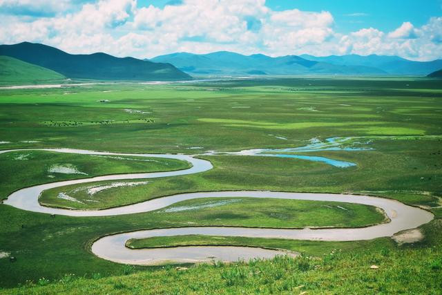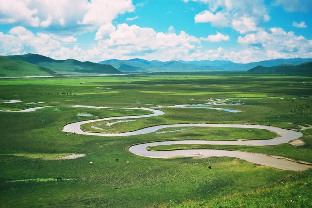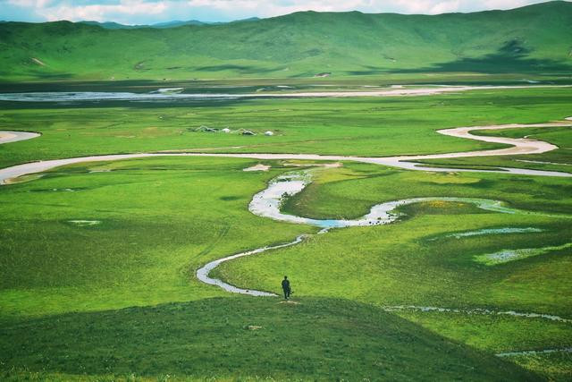 也是黄河水系源头涵养的高原湿地,这里人迹罕至,河流在湿地上蜿蜒曲折,形成了多个回湾,展现出极富韵律的曲线,墨绿草甸上牛羊点点,风景温柔动人。