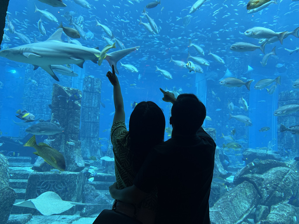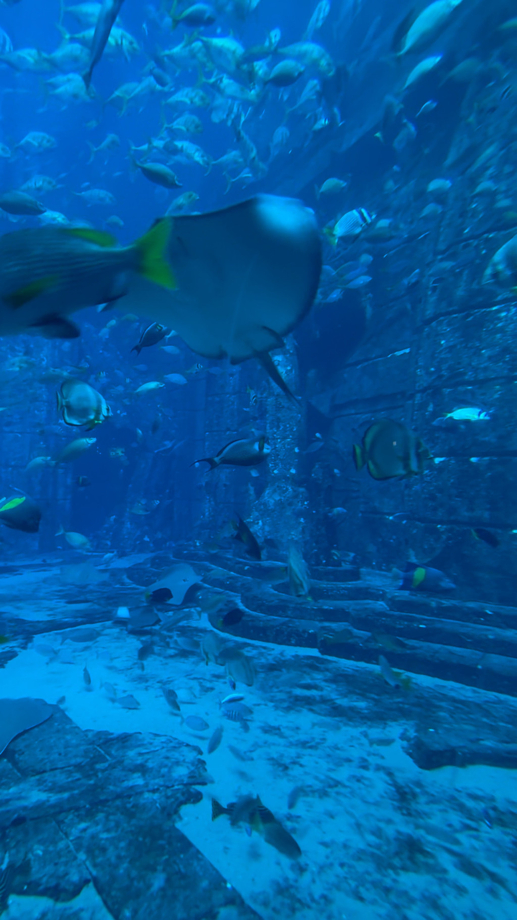 在迪拜的最后一站就是棕榈岛的亚特兰蒂斯水族馆,司机大哥把我们送到轻轨站,我们就去体验轻轨了。轻轨依然是看不到棕榈岛的全貌,因为不够高,但是能看到非常好看的椰树沙滩,还有热气球。从头坐到尾,最后一站下车就是亚特兰蒂斯酒店的大门。我对水族馆一直无感,觉得只是给小朋友看的,况且Dubai Mall里面也有一个很大的水族馆,一开始还略嫌重复。直到亲身走入了这个“失落空间”水族馆,才惊觉自己还是太肤浅了……这个水族馆馆如其名,以失落的远古文明和深海秘境作为灵感,向客人们展示了奇幻的海洋世界。站在水族馆的玻璃前,像是潜入了消失于深海的残垣断壁,与无数游弋的鱼群共舞,非常震撼。