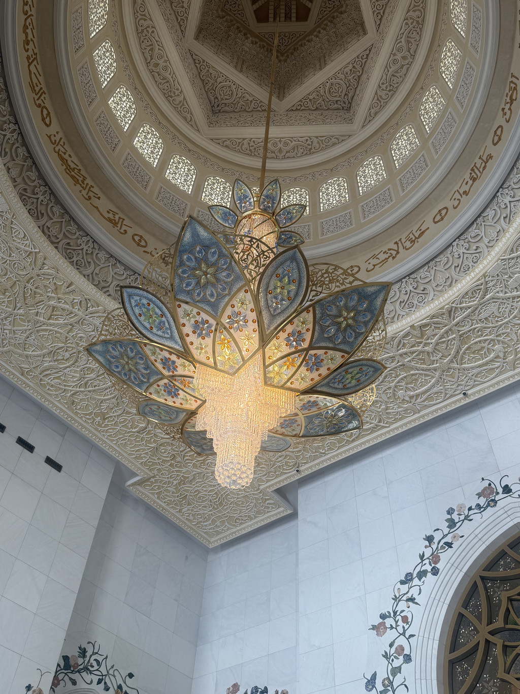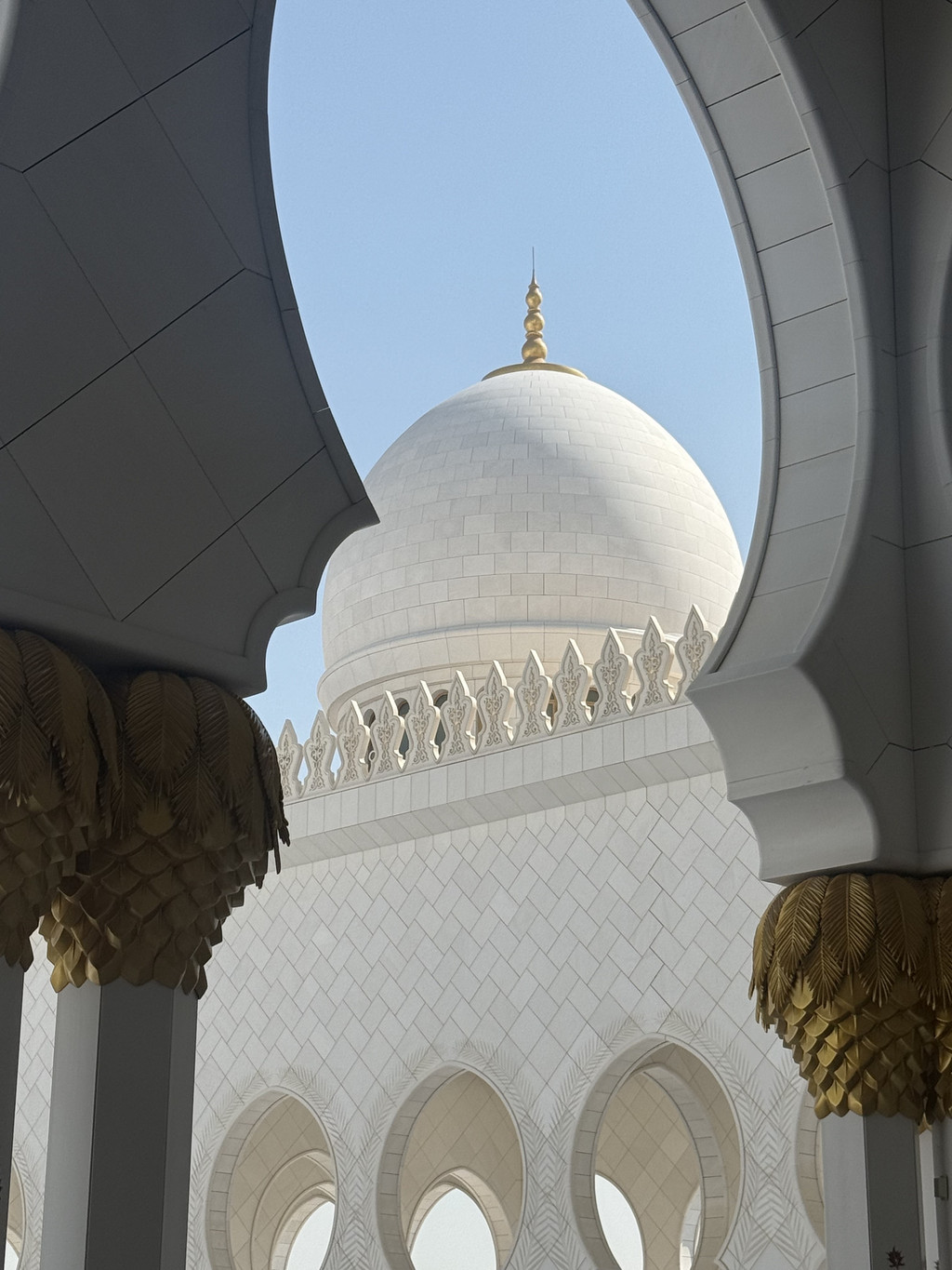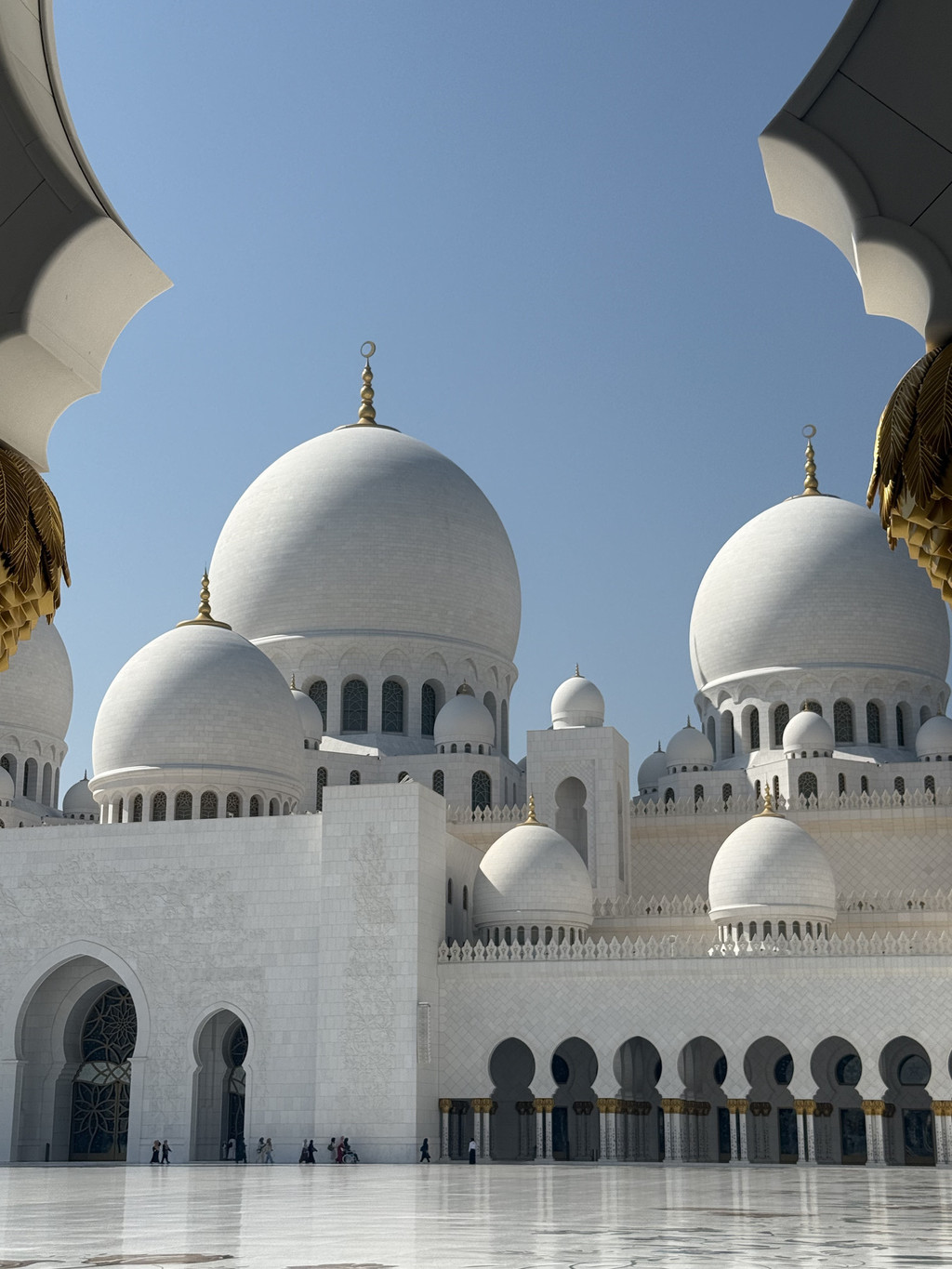 第一站是谢赫扎伊德大清真寺,这是世界第三大的清真寺,哪怕是我已经见过那么多各有美感的清真寺,她的美还是在我心中稳稳地占住了一席之地——像宫殿般纯白得耀眼的外观,如童话世界,一眼望去皆是纯洁与通透,彰显出信仰的力量;寺庙内部更是极尽奢华,纯大理石廊柱、世界上最大的施华洛世奇水晶吊灯、世界上最大的重达40吨的手工羊毛毯,确实难以想象,这只是他们拿来参拜的圣地。然而,奢华绝美之下,意味着的却是对人性的极大束缚:穆斯林信奉“往生论”,宣扬的是人生在世需要接受束缚与苦难,才能通往天堂,继而便不需要再遵守这些戒律了。因此,每一位穆斯林都严格地遵守着教条,世世代代,始终如一。