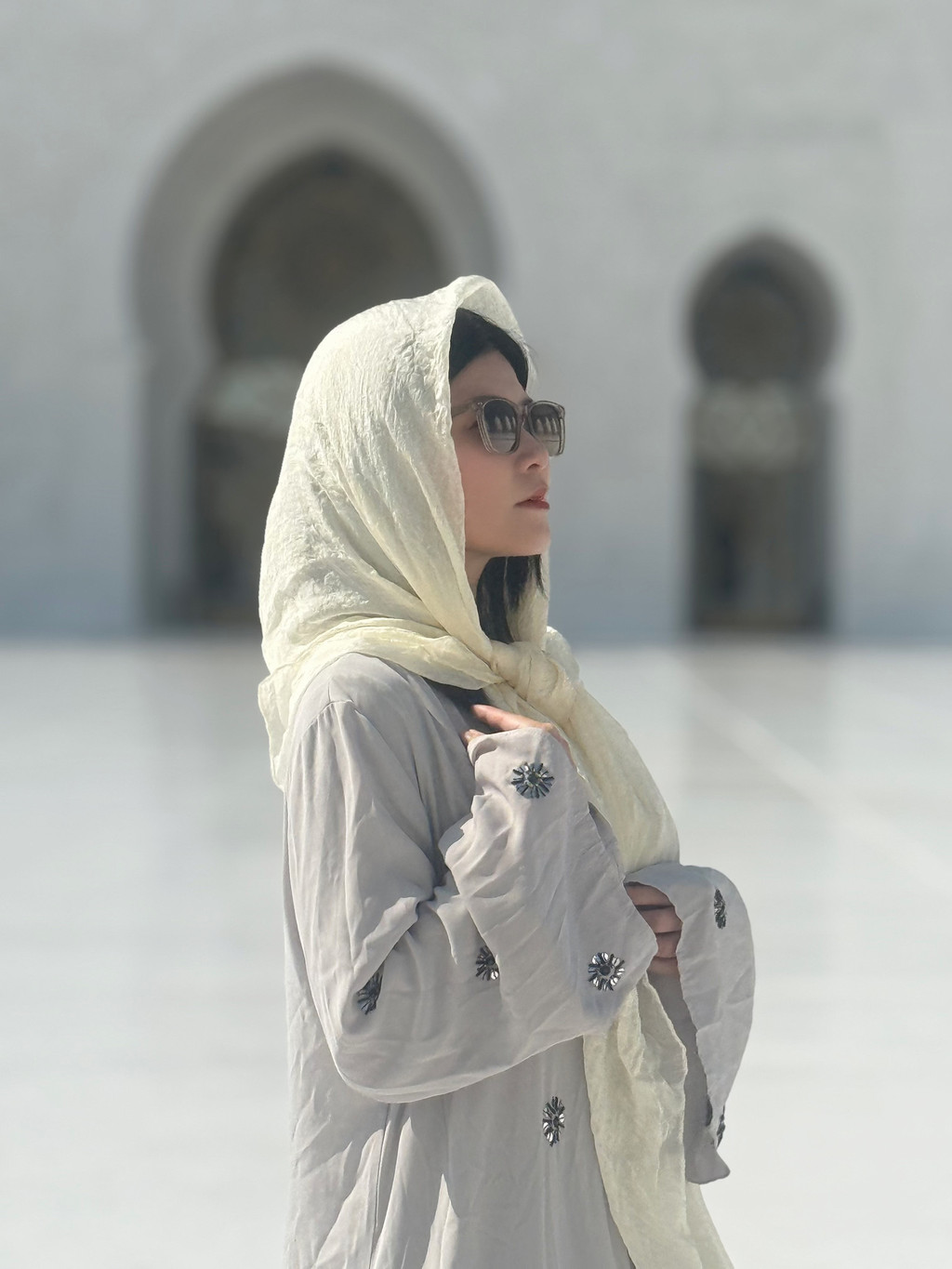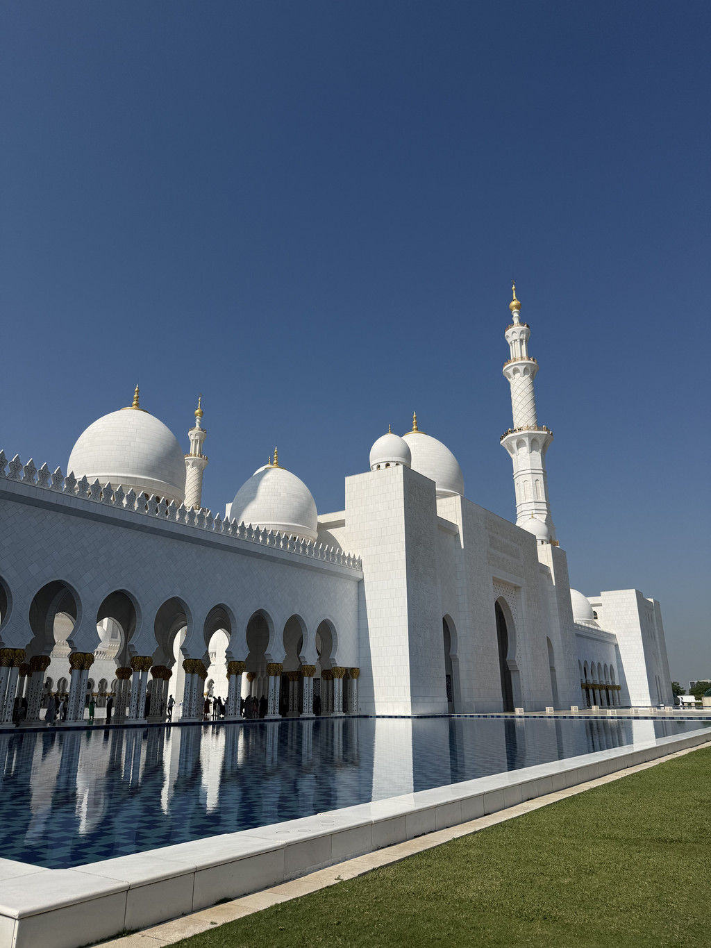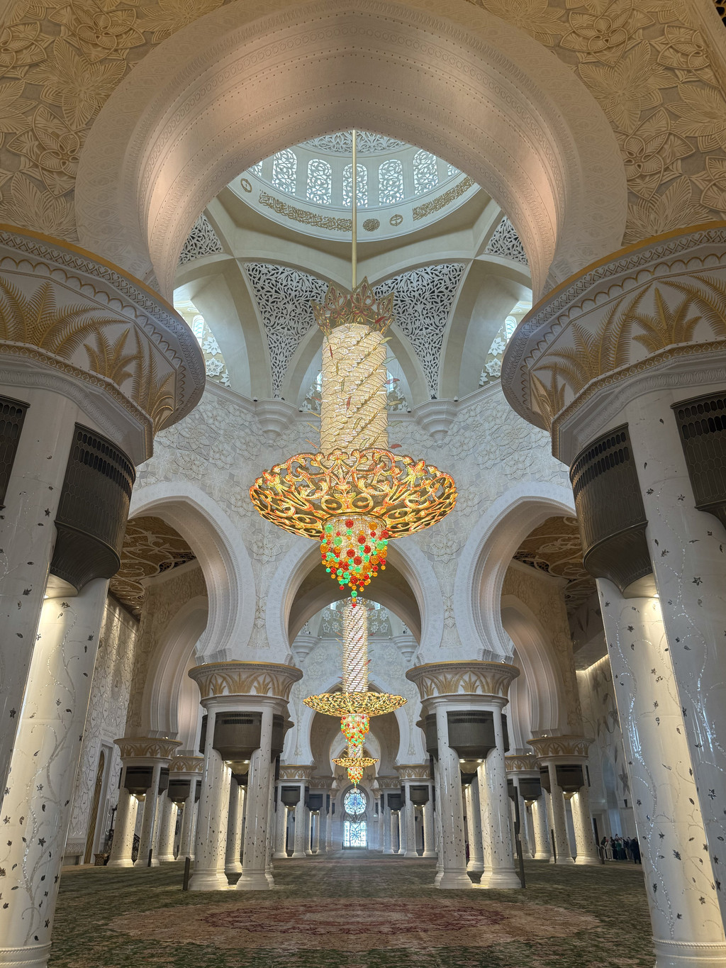 第一站是谢赫扎伊德大清真寺,这是世界第三大的清真寺,哪怕是我已经见过那么多各有美感的清真寺,她的美还是在我心中稳稳地占住了一席之地——像宫殿般纯白得耀眼的外观,如童话世界,一眼望去皆是纯洁与通透,彰显出信仰的力量;寺庙内部更是极尽奢华,纯大理石廊柱、世界上最大的施华洛世奇水晶吊灯、世界上最大的重达40吨的手工羊毛毯,确实难以想象,这只是他们拿来参拜的圣地。然而,奢华绝美之下,意味着的却是对人性的极大束缚:穆斯林信奉“往生论”,宣扬的是人生在世需要接受束缚与苦难,才能通往天堂,继而便不需要再遵守这些戒律了。因此,每一位穆斯林都严格地遵守着教条,世世代代,始终如一。