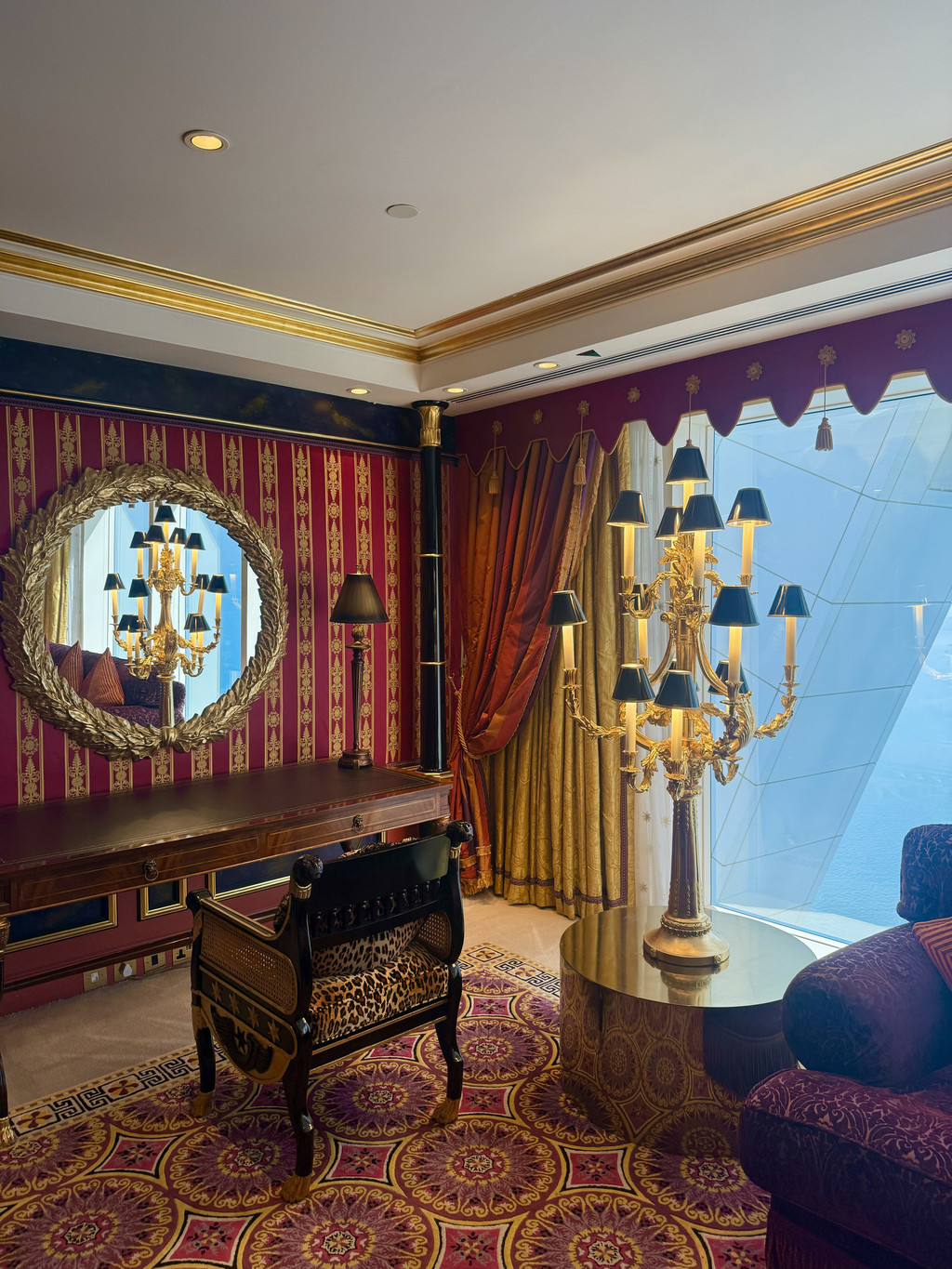 同样的,回到迪拜那座传说中的帆船酒店,参观当年价值60万RMB一晚的顶层总统套房,也是有差不多的感觉:整个房间主色调是红色和金色,很有阿拉伯沙漠风情的内饰,显得特别豪华;但是更吸引人的其实是窗外海滩的美景,一眼望过去的碧蓝海水和黄沙,真的令人非常心旷神怡。如今的帆船酒店再也不复当年那个傲视全球酒店的普通人无法企及的地位了,毕竟长江后浪推前浪,它也开始“沦落风尘”,售卖起400多块钱RMB一张的观光门票(加杯咖啡700多),当作景点看看还是可以的。