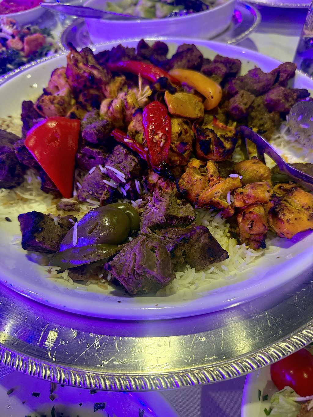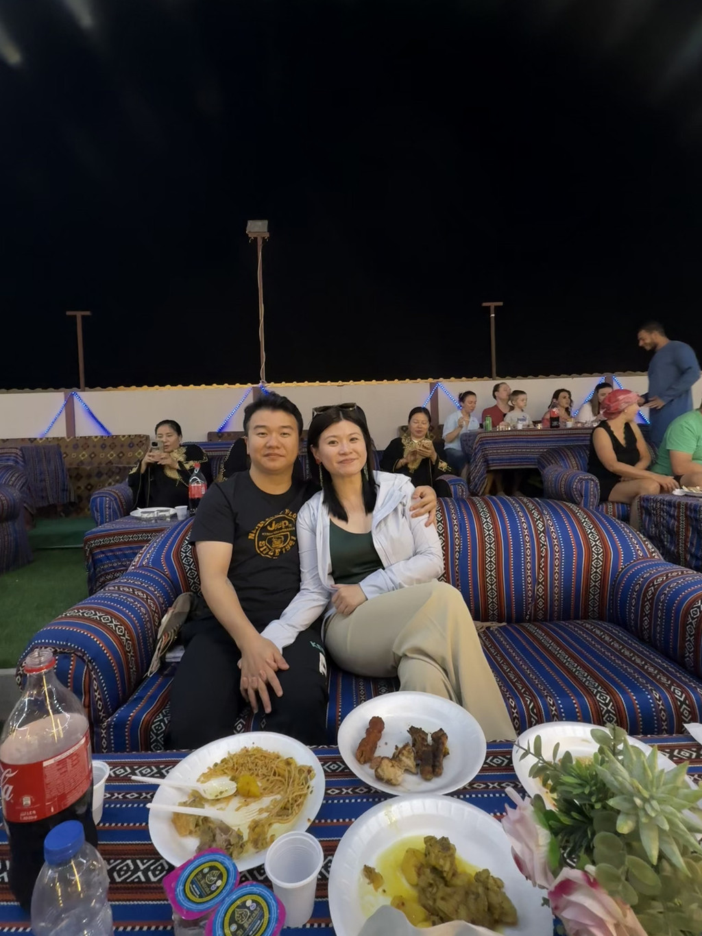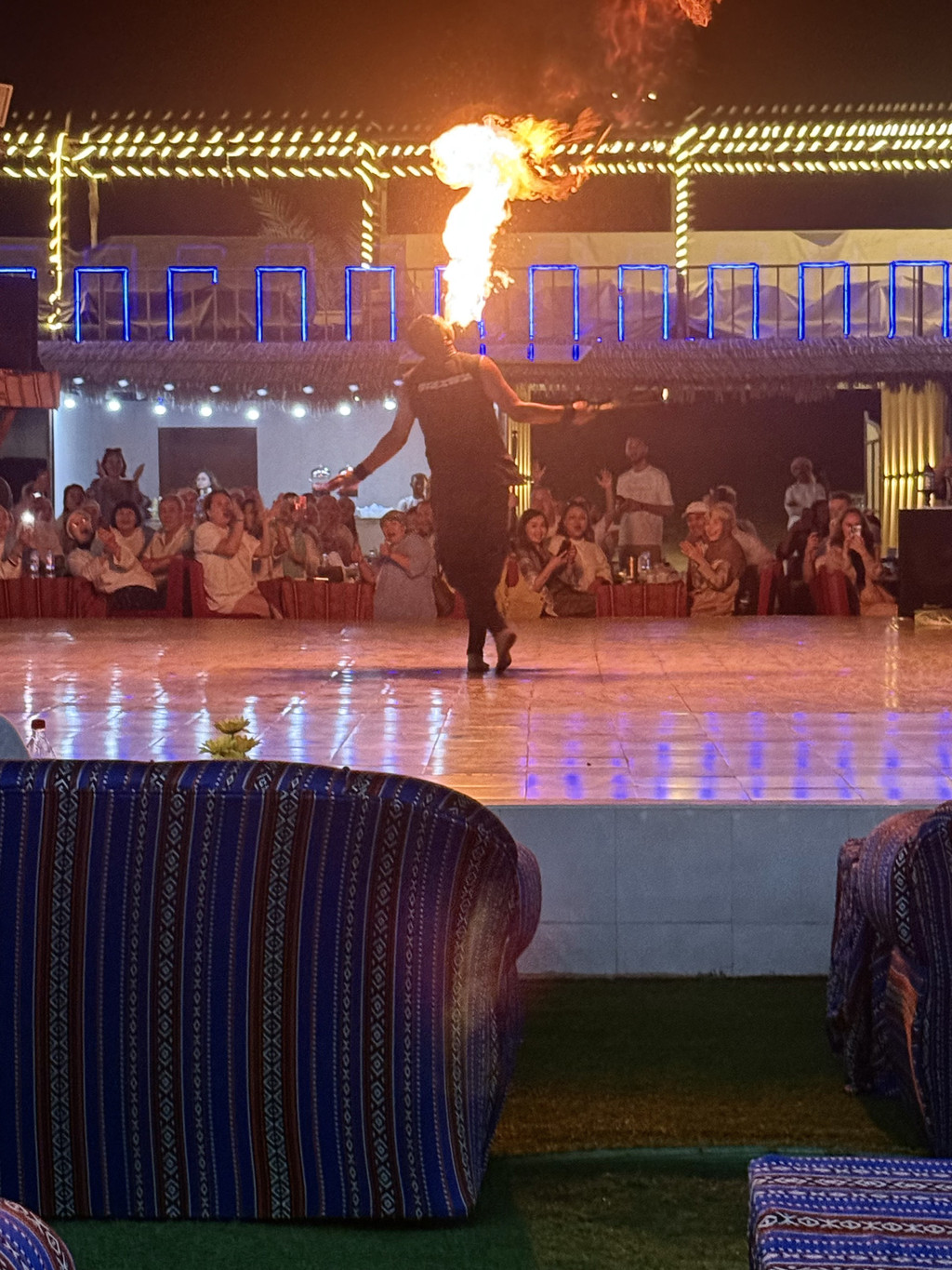 沙漠不是第一次去,越野车冲沙是第一次——我们的司机大哥凭着11年的威水驾龄,各种炫技,还是相当刺激的。落日之下的沙漠,苍茫中透露着浪漫,黄沙里的余晖让人陶醉不已,只恨落日太短暂,转眼就到了营地,天黑了。这个位于沙迦的营地非常奇妙,感觉就是一个大型的兜售集市,从进门起就没有停过被推销东西:进入VIP区域每位120RMB,行吧,专属烤肉专属双人座沙发;跟鹰隼拍照,40RMB,没玩过鸟,拍了一堆照片,到此一游;骑骆驼,兜风+拍照200RMB,谢邀,免费走一圈就好;还有手绘、冰箱贴、水果等一大堆奇奇怪怪的东西,隔几分钟就来卖一下,可惜我们没带够现金也没带卡(因为司机说冲沙不要带那么多东西,卷进沙子里就通通回不来了),无力消费了哈哈~ 有一说一,烤肉真的是我们觉得中东地区最能让我们中国胃比较好接受的东西了,不知道是不是VIP的原因,这里的烤肉又大又好吃,我可能一个人干掉了三四串。餐后还有表演,喷火啥的还是挺厉害的,有些风情舞娘据说是来自埃及,打扮很性感,也算是气氛到位了。