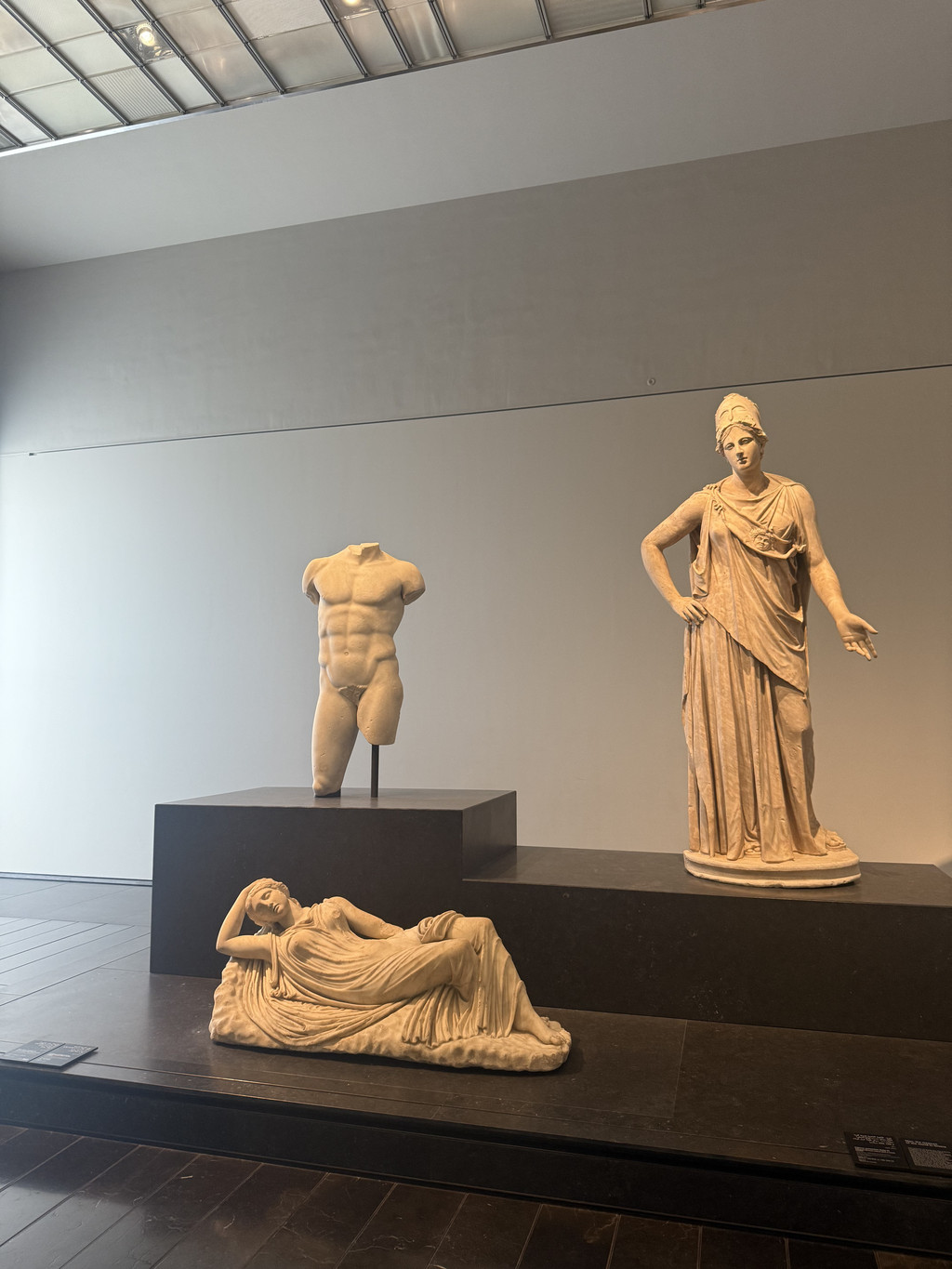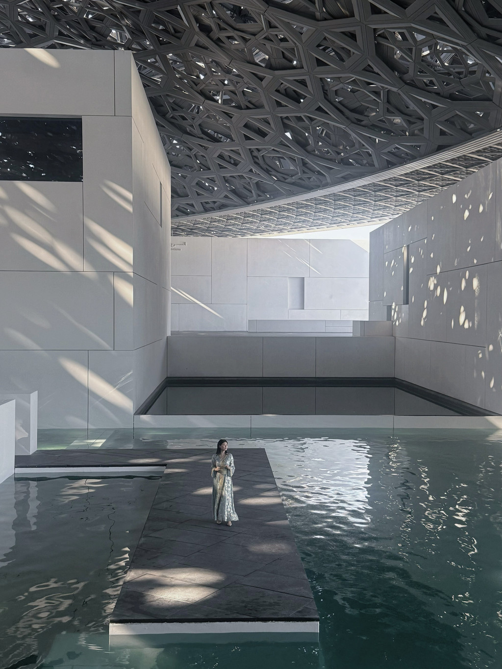 离开略显压抑的清真寺,我们前往海上卢浮宫。我这种毫无艺术细胞的人,对艺术馆的兴趣相当有限,更何况这些展品都是从海外租借来的,似乎更像是阿联酋为了彰显实力而为之,等于送了一笔10亿欧元的买卖给法国,真·壕无人性。但是有一说一,这个建筑本身是真的好看,由法国人操刀设计,打卡非常出片,光影美学被运用到了极致,果然,有钱能使鬼推磨。