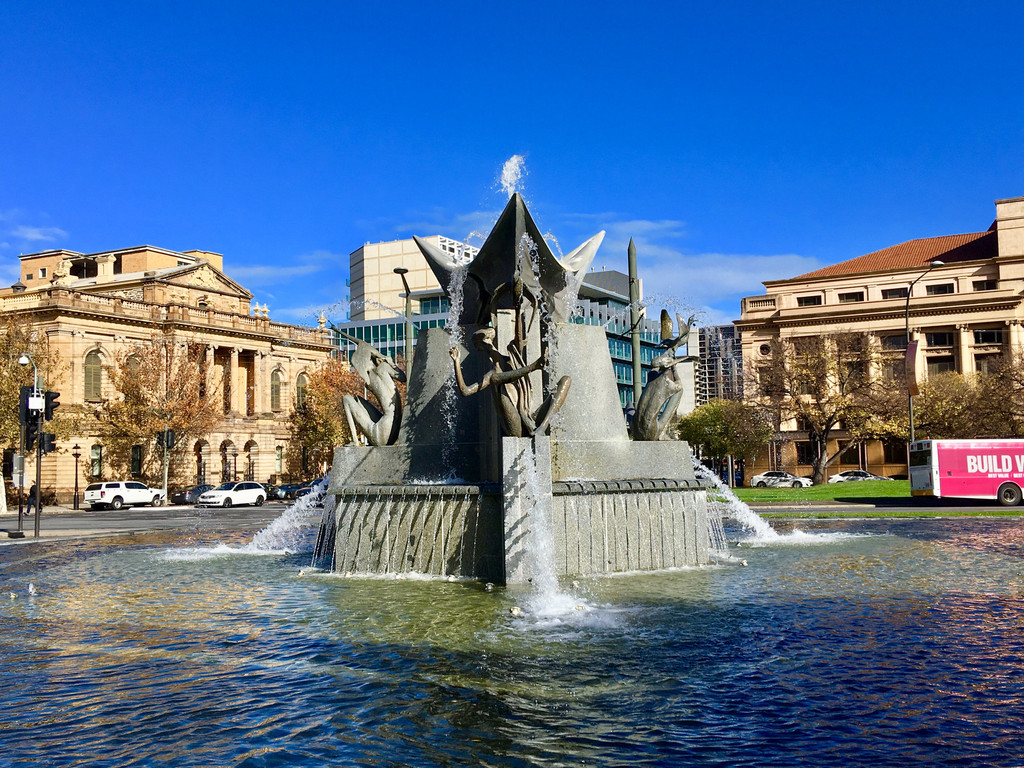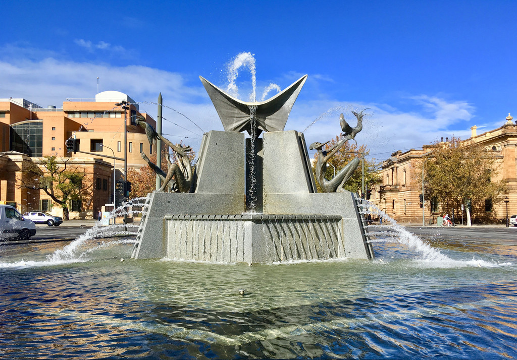 三河喷泉雕塑 Three Rivers Fountain 位于维多利亚广场的南端,坐落在一个 18 米宽的六角形水池中。 喷泉由出生于阿德莱德的澳大利亚著名雕塑家约翰 · 道伊(John Dowie,1915 ~ 2008)设计,以纪念女王伊丽莎白二世和爱丁堡公爵 1963 年的到访,五年后于 1968 年 5 月 28 日揭幕。