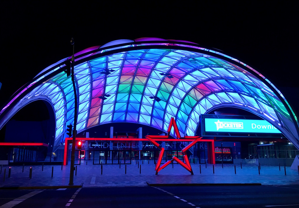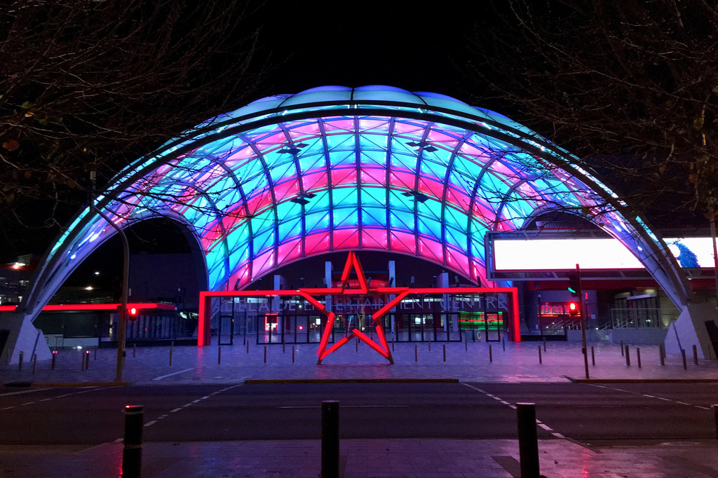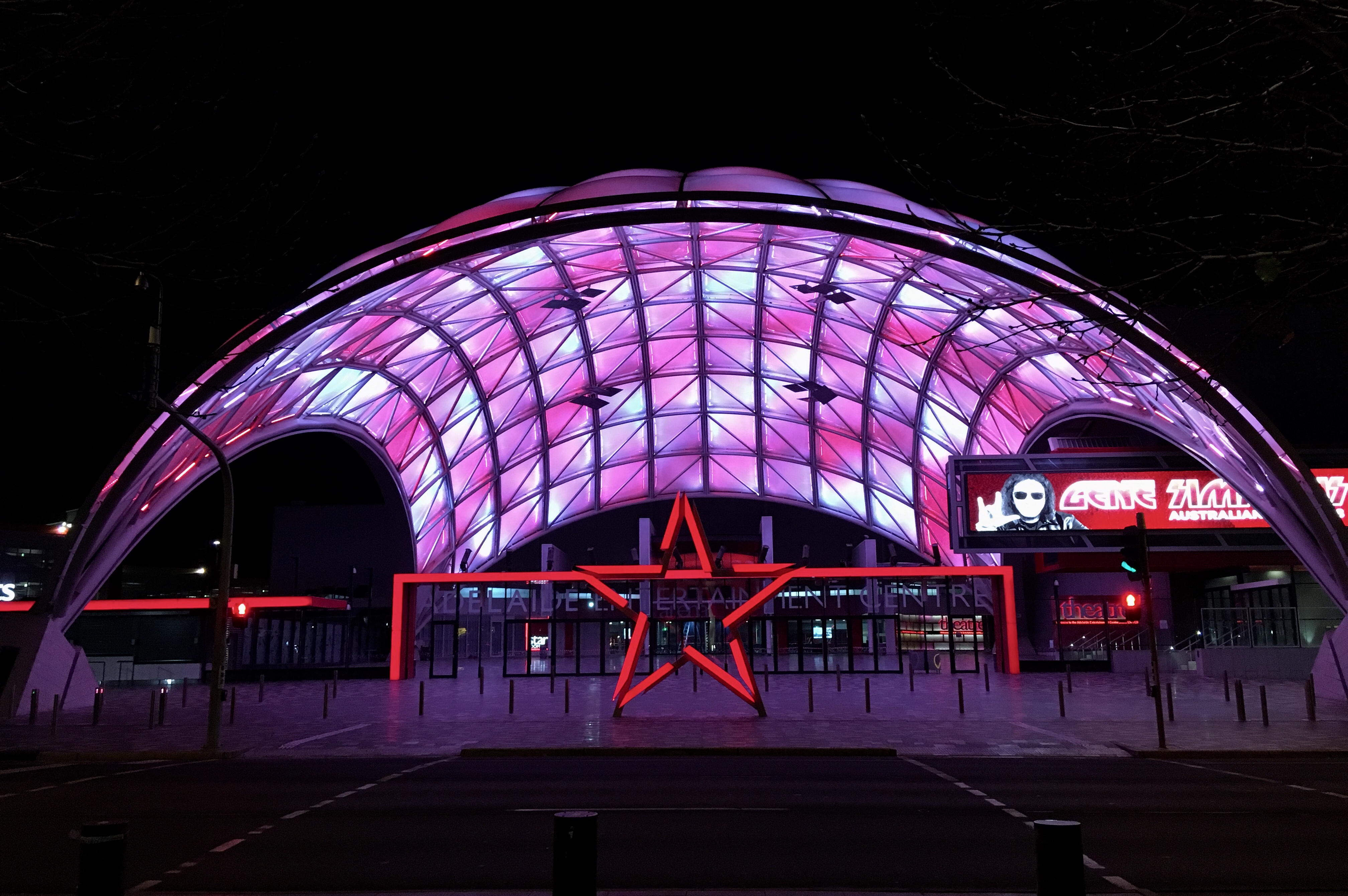 阿德莱德娱乐中心这一耗资 5200 万美元的重建项目于 2010 年 3 月正式揭幕,该项目由 Design Inc 设计公司设计,中心入口的设计采用新型 ETFE 透明膜材穹顶与动感 LED 照明系统相结合,形成了强烈的视觉感。