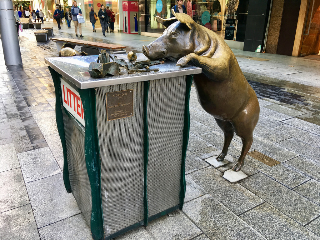 街上还有一系列雕塑,例如 “四只小猪一日游 A Day Out”、“购物中心球体 Mall‘s Balls” 以及 “滑倒 The Slide” 等。