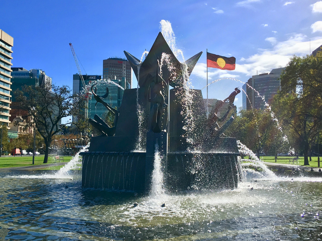该喷泉设计为三面型,代表着南澳大利亚的三条河流。其中, 一名手持一只长翅膀朱鹭的土著男子代表着位于阿德莱德东部的穆雷河 River Murray;一名手持苍鹭的欧洲女子代表着南部的温卡帕灵伽河 Onkaparinga River;而一名手持黑天鹅的欧洲女子则代表着北部一直延伸至西侧沿海的托伦斯河 River Torrens。