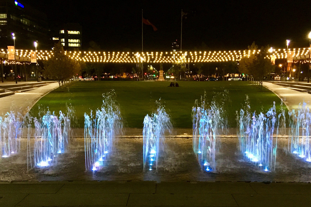 除了这些雕像, 广场南侧建有现代化喷泉雕塑 —— 阿德莱德三河喷泉 Three Rivers Fountain Adelaide,广场北侧还有一排喷水。广场周围有一系列重要建筑:广场东面是圣弗朗西斯 · 泽维尔大教堂 St. Francis Xavier's Cathedral;南面有南澳最高法院;西面是希尔顿酒店、阿德莱德中央市场、唐人街,各种好吃的、好喝的可以在那里品尝到;北面则是邮政总局和市政厅。站在广场中央,眺望四周,阿德莱德新旧两个时代的建筑尽收眼底。