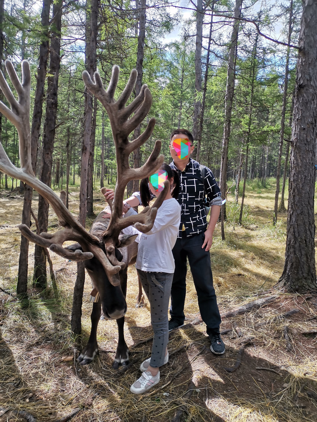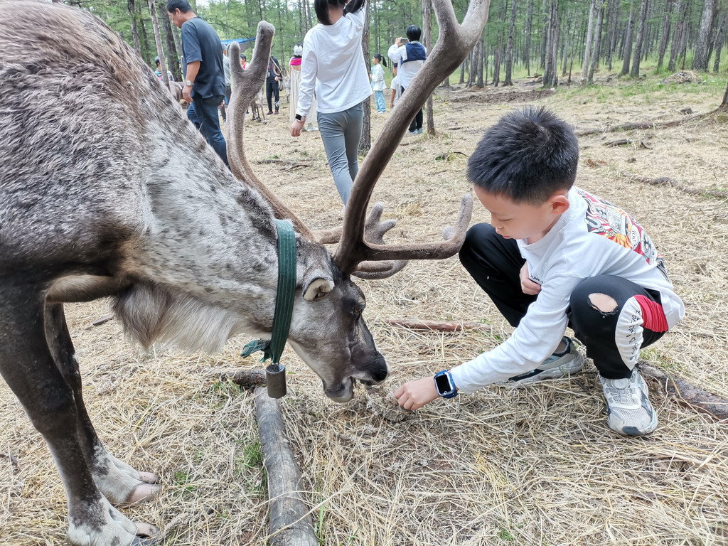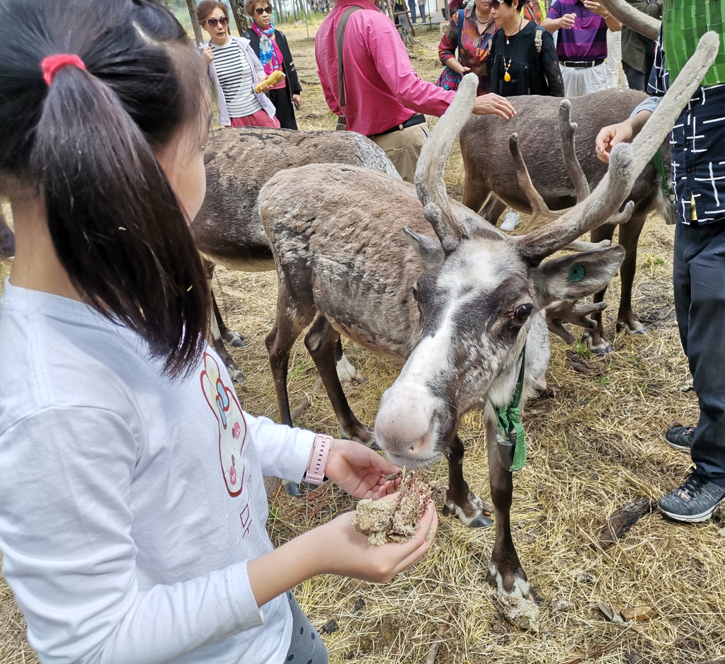 还有狍子和驯鹿。最吸引孩子的就是亲密接触驯鹿,20元/篮购买鹿食(苔藓),驯鹿就会围着你转,鹿角非常抢镜,驯鹿也是真的超级温顺可爱。