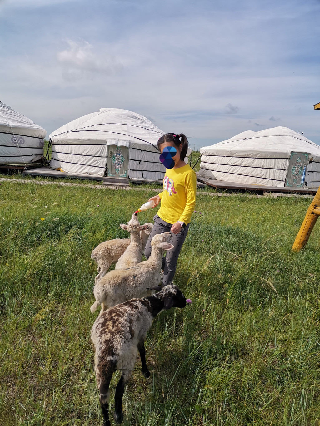 [D5] 黑山头->186彩带河->巴尔虎马之舞演出->满洲里。上午是牧民家造访,牧民会款待自家当天现挤的牛奶(煮沸消毒)和一些手工奶制品,味道还是不错的。我发现牧民家蒙古包的墙上挂的是昭君的画像:)。然后有喂羊羔、射箭、挤奶、草原小火车、穿蒙古族服装合影等互动活动。