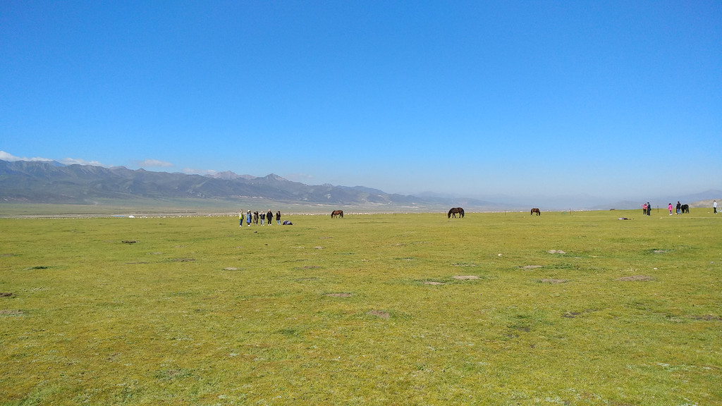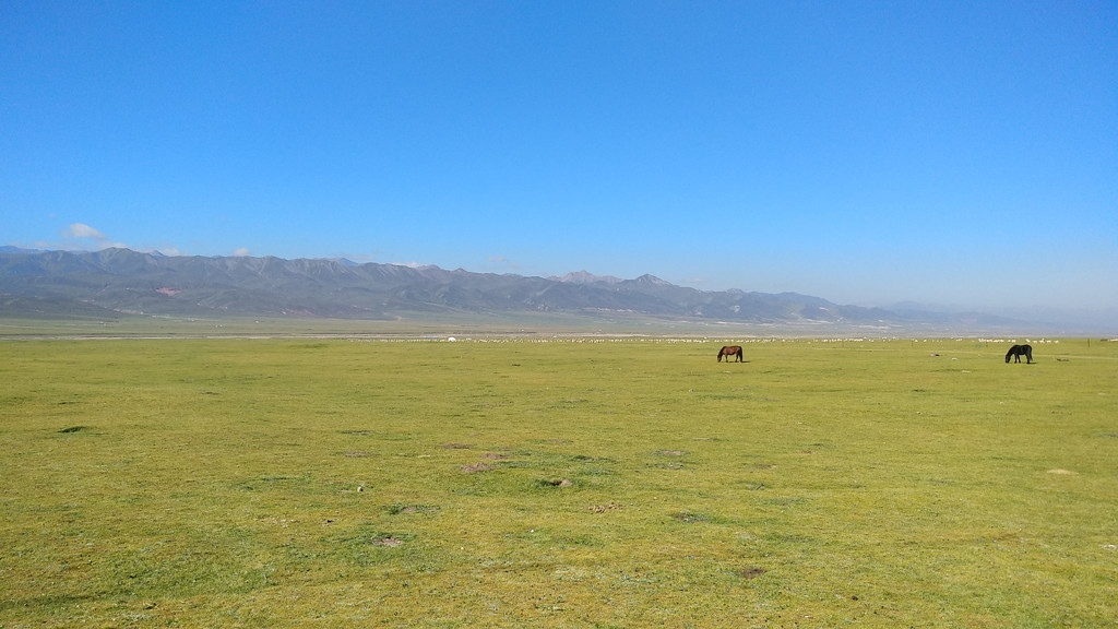 透明的天空,纯净的湖水,碧绿的草原。蓝得纯正,绿得深沉,艳得蓬勃。