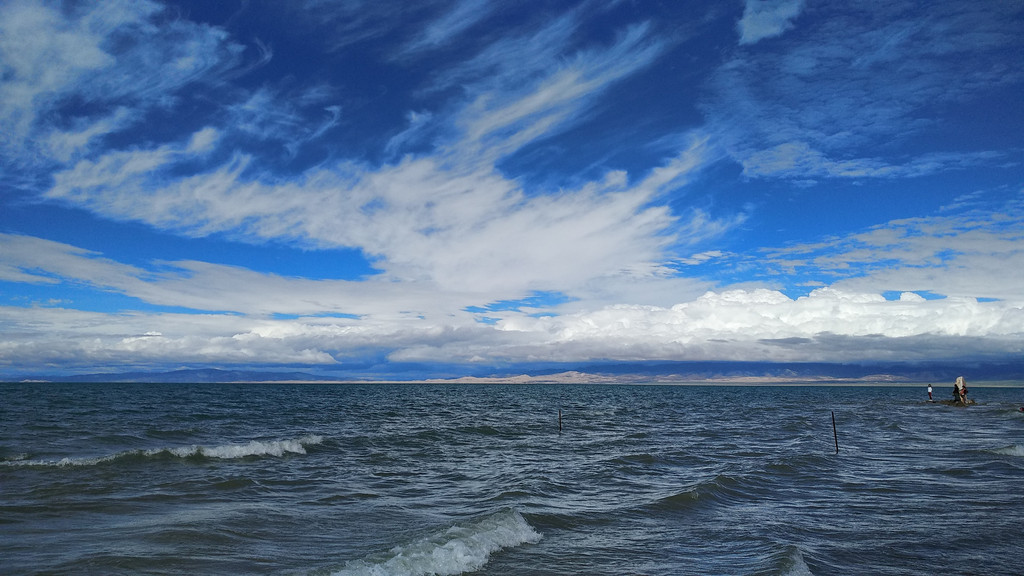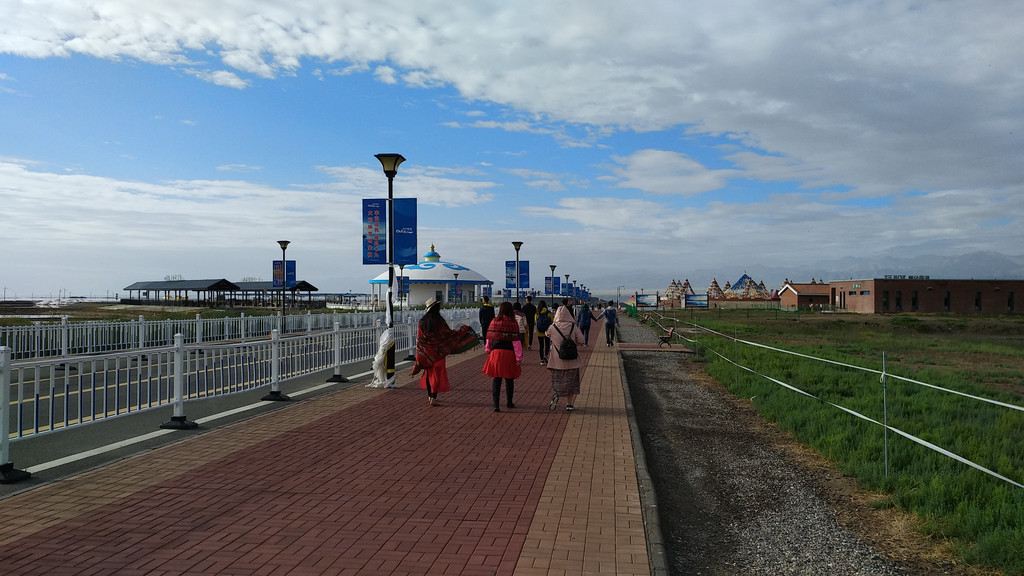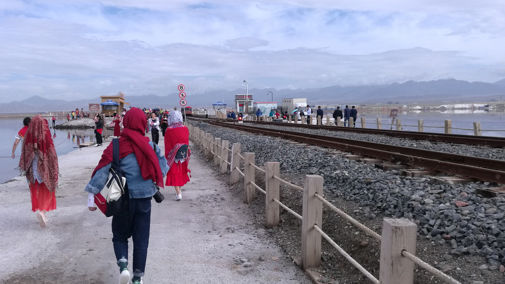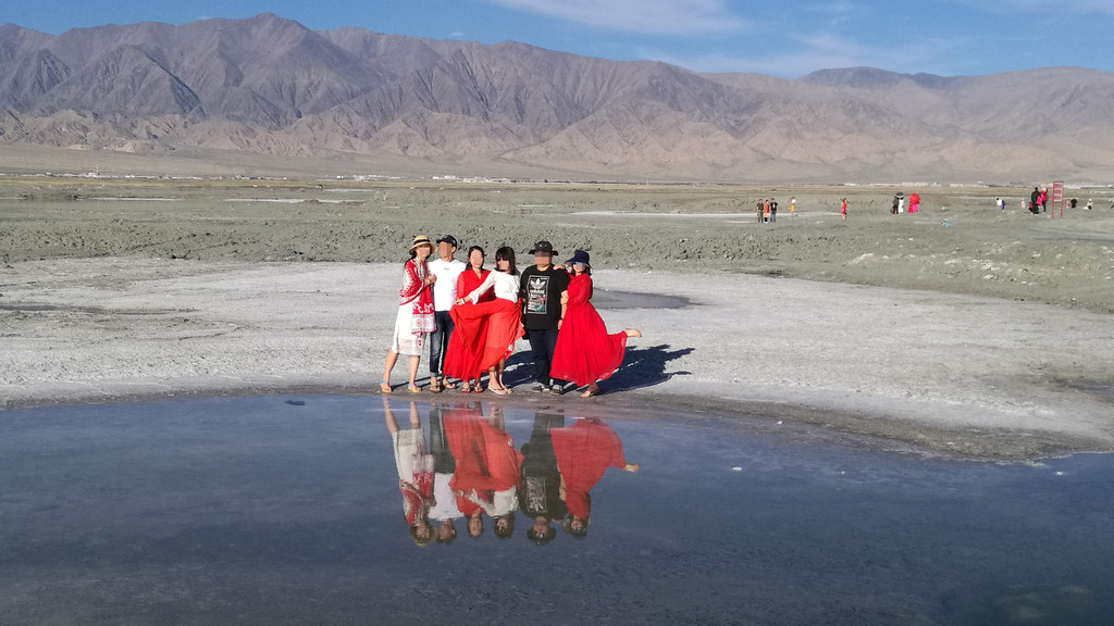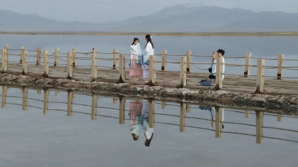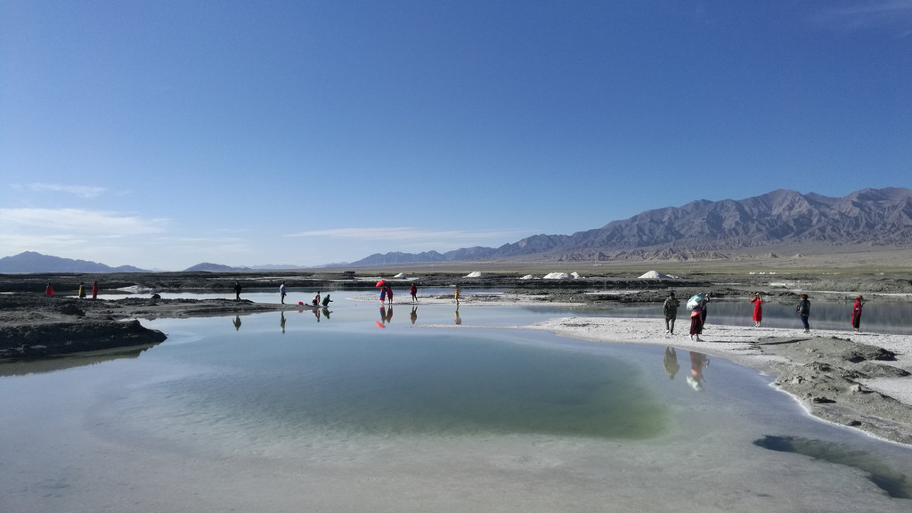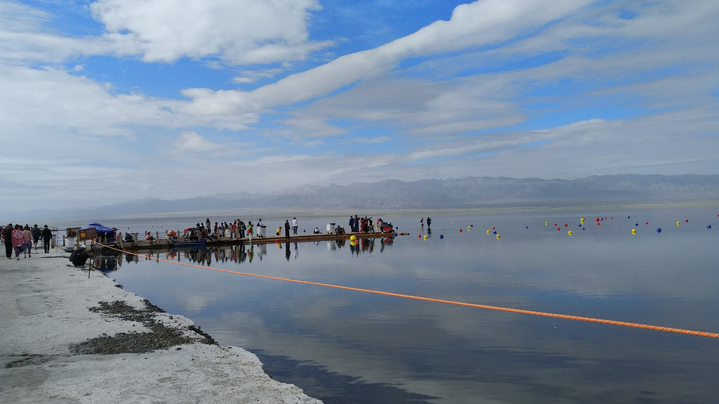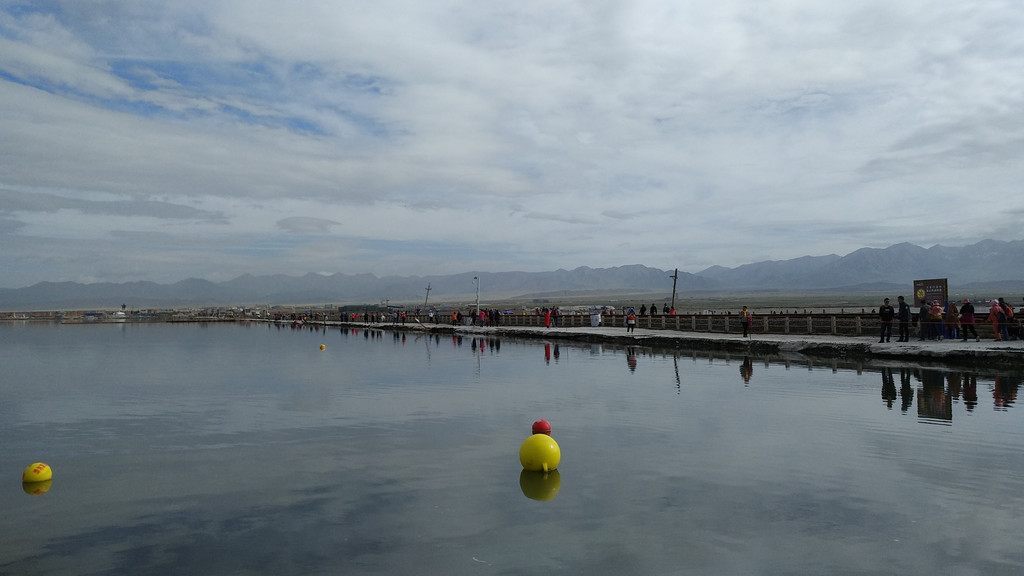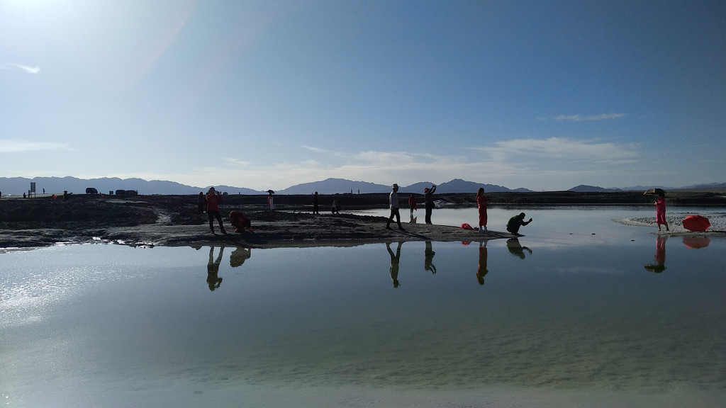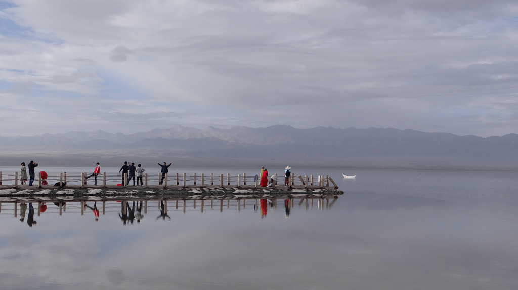茶卡盐湖是网红景点,旺季时人山人海。今天游客不算多,放眼望去,手提身背鲜艳服装的女士居多。今天多云,有时能看到蓝天,湖水的倒影也清楚。但要说有多惊喜,不见得。